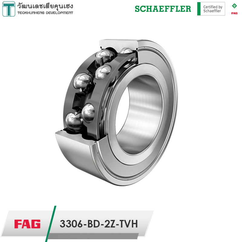 FAG 3306-BD-2Z-TVH มีขนาดวงใน 30 มิล วงนอก 72 มิล หนา 30.2 มิล เป็นตลับลูกปืนเม็ดกลมแบบมีมุมสัมผัส 30° องศา แบบสองแถว ฝาเหล็กสองด้าน เหมาะสำหรับรองรับแรงโหลดได้มากทั้งในแนวรัศมีและแนวแกน