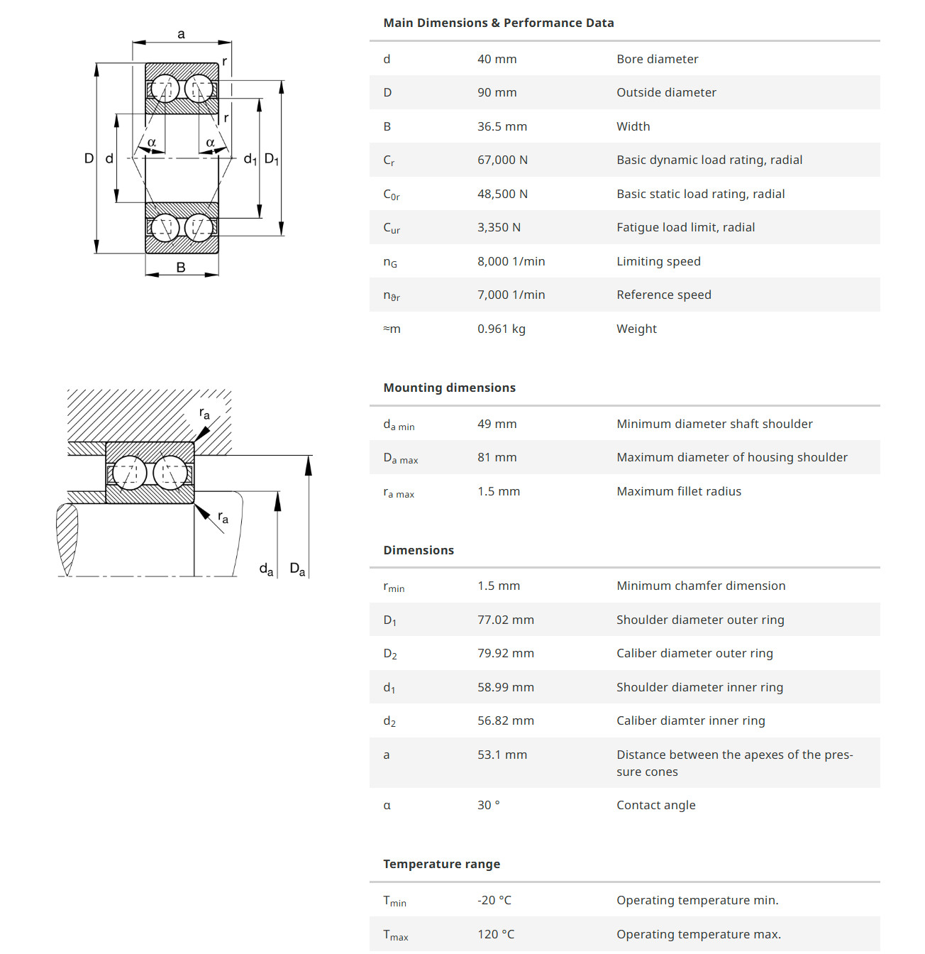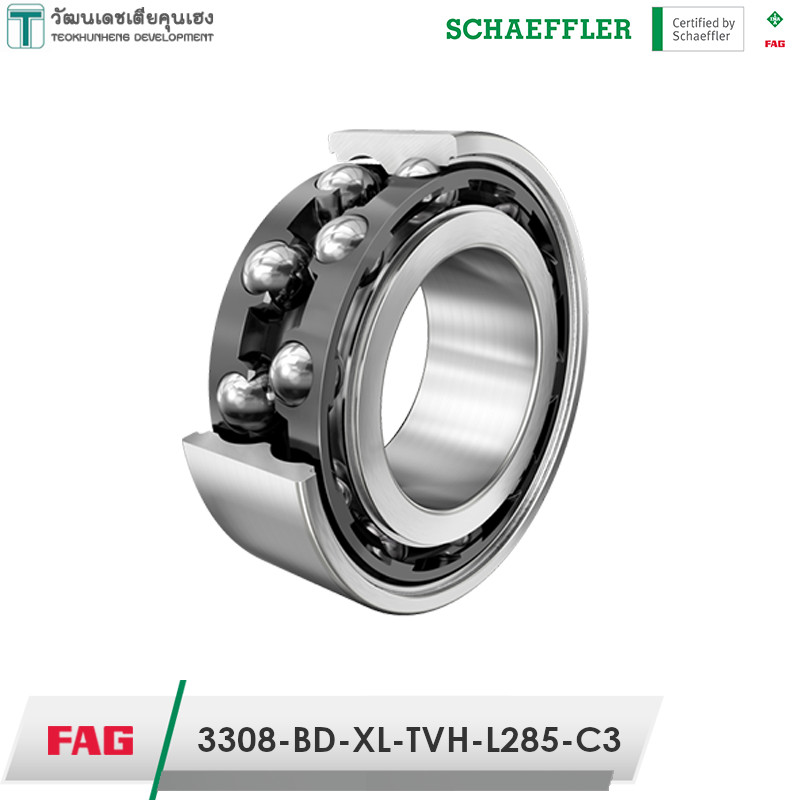 FAG 3308-BD-XL-TVH-L285-C3 มีขนาดวงใน 40 มิล วงนอก 90 มิล หนา 36.5 มิล เป็นตลับลูกปืนเม็ดกลมแบบมีมุมสัมผัส 30° องศา แบบสองแถว เหมาะสำหรับรองรับแรงโหลดได้มากทั้งในแนวรัศมีและแนวแกน แบริ่งอุตสาหกรรม