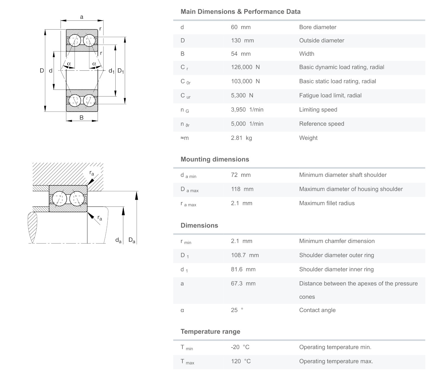 FAG 3312-B-TVH-C3 มีขนาดวงใน 60 มิล วงนอก 130 มิล หนา 54 มิล เป็นตลับลูกปืนเม็ดกลมแบบมีมุมสัมผัส 25° องศา แบบสองแถว เหมาะสำหรับรองรับแรงโหลดได้มากทั้งในแนวรัศมีและแนวแกน