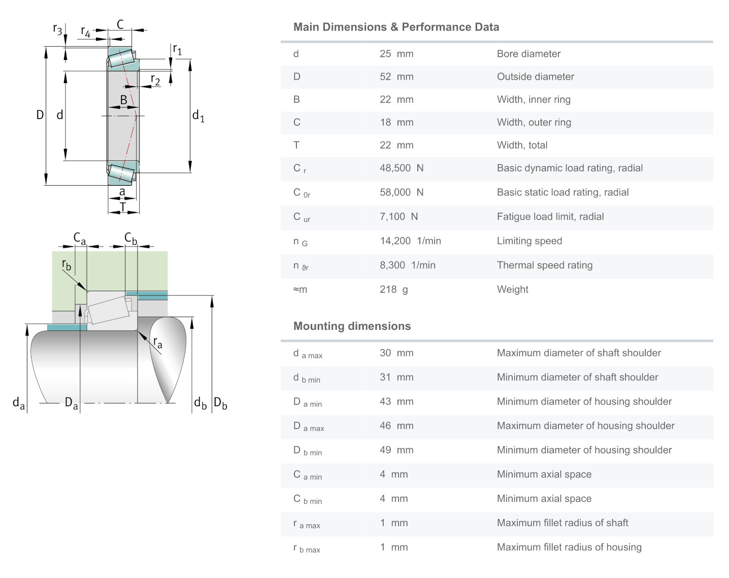 FAG 33205 มีขนาดวงใน 25 มิล วงนอก 52 มิล หนารวม 22 มิล เป็นตลับลูกปืนเม็ดเรียว หรือที่เรียกว่า เตเปอร์ (Tapered) แกนนอกมีลักษณะเป็นปลอกคล้ายถ้วย (Cup) แยกออกจากตัวลูกปืน(Cone)ได้ ทำให้สะดวกต่อการติดตั้ง สามารถรองรับแรงโหลดได้สูงทั้งแนวรัศมีและแนวแกน