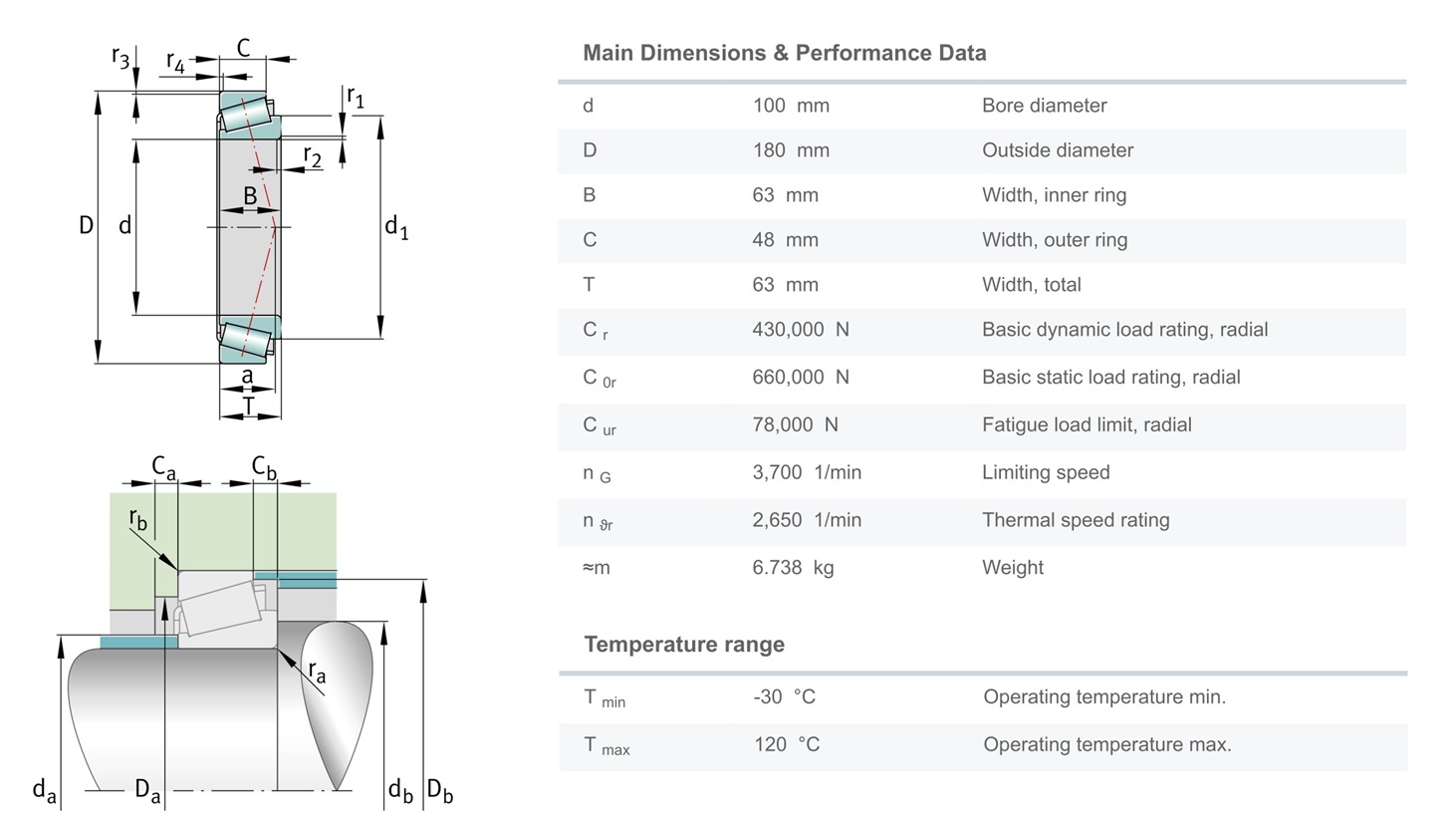 FAG 33220 มีขนาดวงใน 100 มิล วงนอก 180 มิล หนารวม 63 มิล เป็นตลับลูกปืนเม็ดเรียว หรือที่เรียกว่า เตเปอร์ (Tapered) แกนนอกมีลักษณะเป็นปลอกคล้ายถ้วย (Cup) แยกออกจากตัวลูกปืน(Cone)ได้ ทำให้สะดวกต่อการติดตั้ง สามารถรองรับแรงโหลดได้สูงทั้งแนวรัศมีและแนวแกน