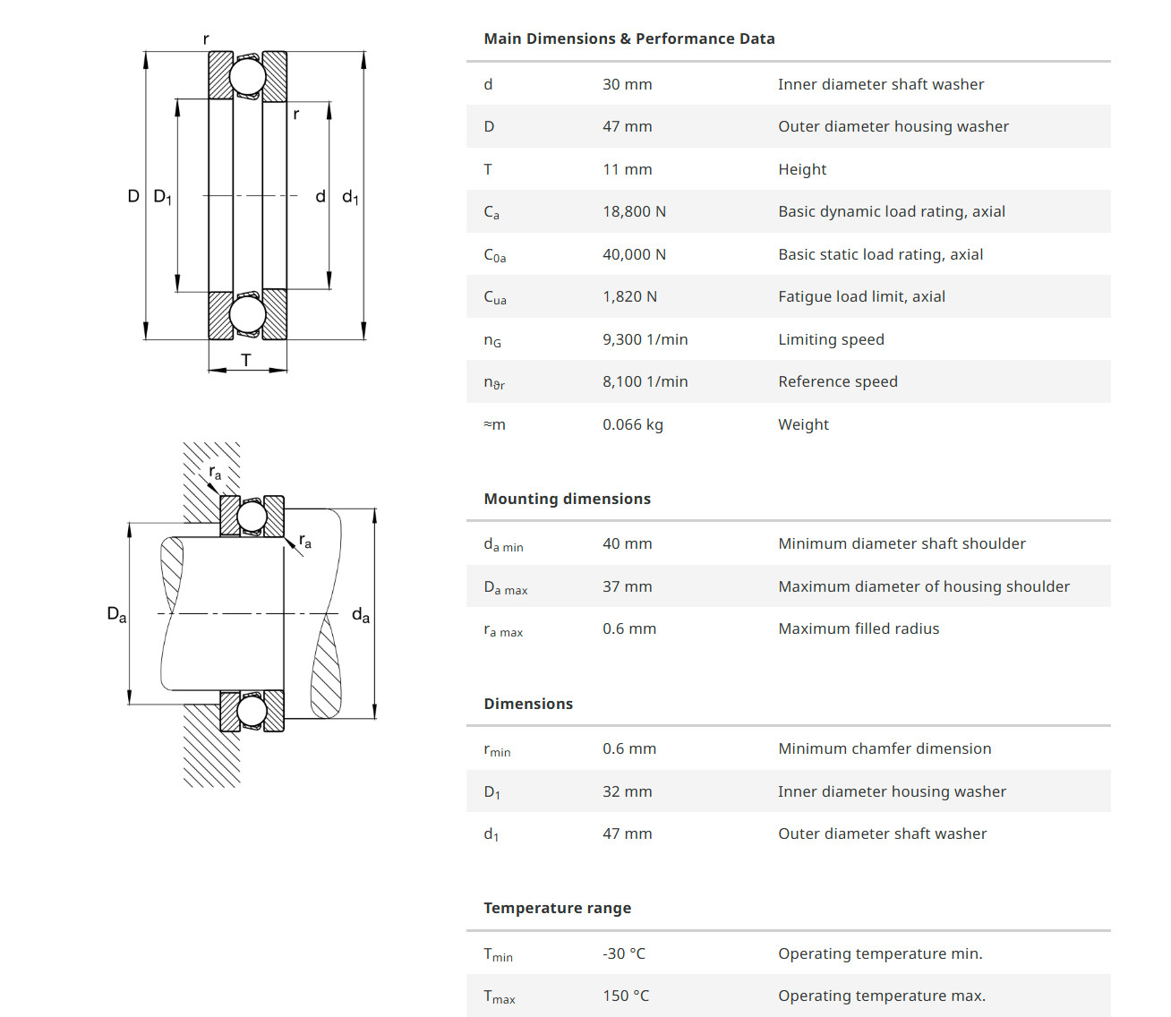 FAG 51106 มีขนาดวงใน 30 มิล วงนอก 47 มิล หนารวม 11 มิล เป็นตลับลูกปืนกันรุนเม็ดกลม มีฝาประกบ 2 ด้าน ที่สามารถแยกถอดประกอบได้ ทำให้สะดวกต่อการติดตั้ง สามารถรองรับแรงโหลดได้สูงในแนวแกน