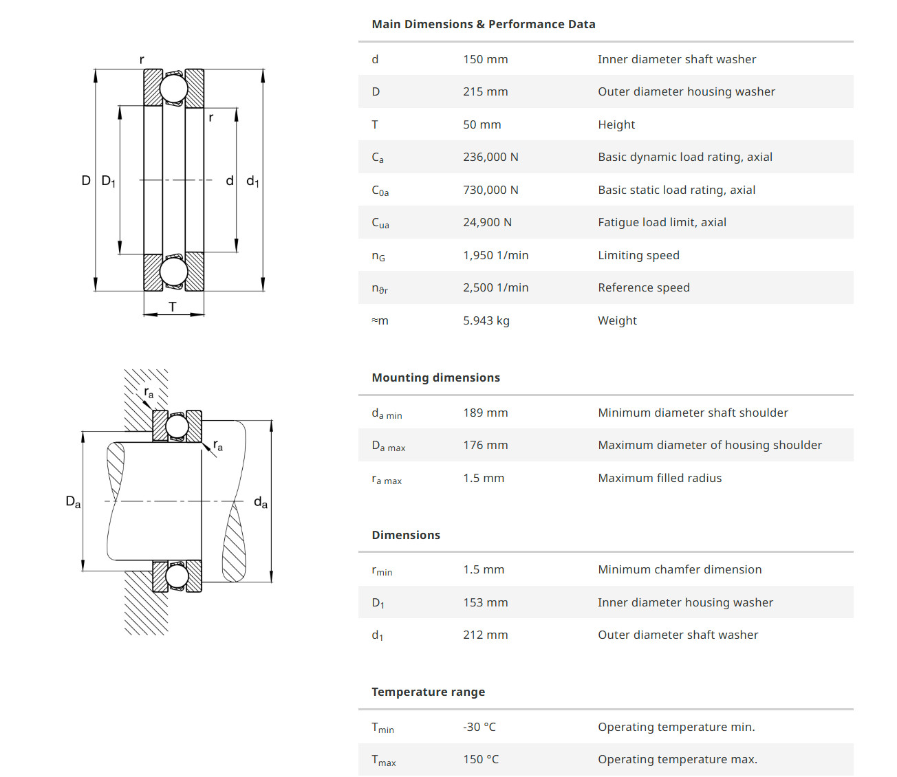 FAG 51230-MP มีขนาดวงใน 150 มิล วงนอก 215 มิล หนารวม 50 มิล เป็นตลับลูกปืนกันรุนเม็ดกลม รังทองเหลือง มีฝาประกบ 2 ด้าน ที่สามารถแยกถอดประกอบได้ ทำให้สะดวกต่อการติดตั้ง สามารถรองรับแรงโหลดได้สูงในแนวแกน