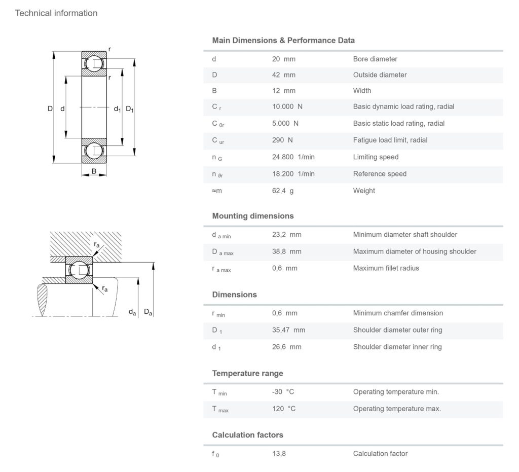 FAG 6004-C3 มีขนาดวงใน 20 มิล วงนอก 42 มิล หนา 12 มิล เป็นตลับลูกปืนเม็ดกลมร่องลึก รังเหล็ก ไม่มีฝา แถวเดียว มีแรงเสียดทานต่ำ เสียงเงียบ สามารถรองรับความเร็วรอบสูง รองรับแรงทั้งแนวรัศมีและแนวแกน