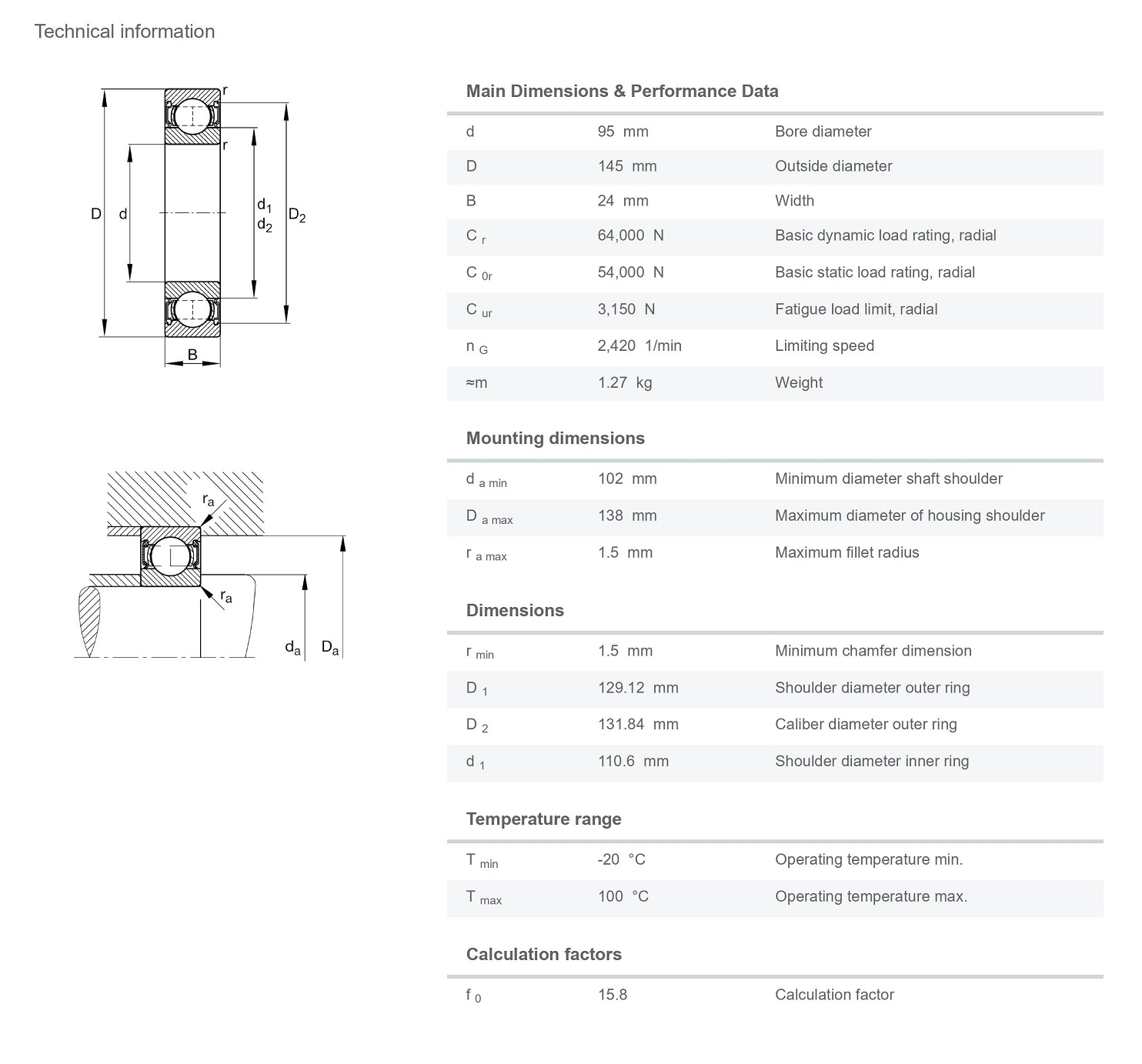 FAG 6019-2RSR มีขนาดวงใน 95 มิล วงนอก 145 มิล หนา 24 มิล เป็นตลับลูกปืนเม็ดกลมร่องลึก ฝายางสองด้าน แถวเดียว รังเหล็ก มีแรงเสียดทานต่ำ เสียงเงียบ สามารถรองรับความเร็วรอบสูง รองรับแรงทั้งแนวรัศมีและแนวแกน
