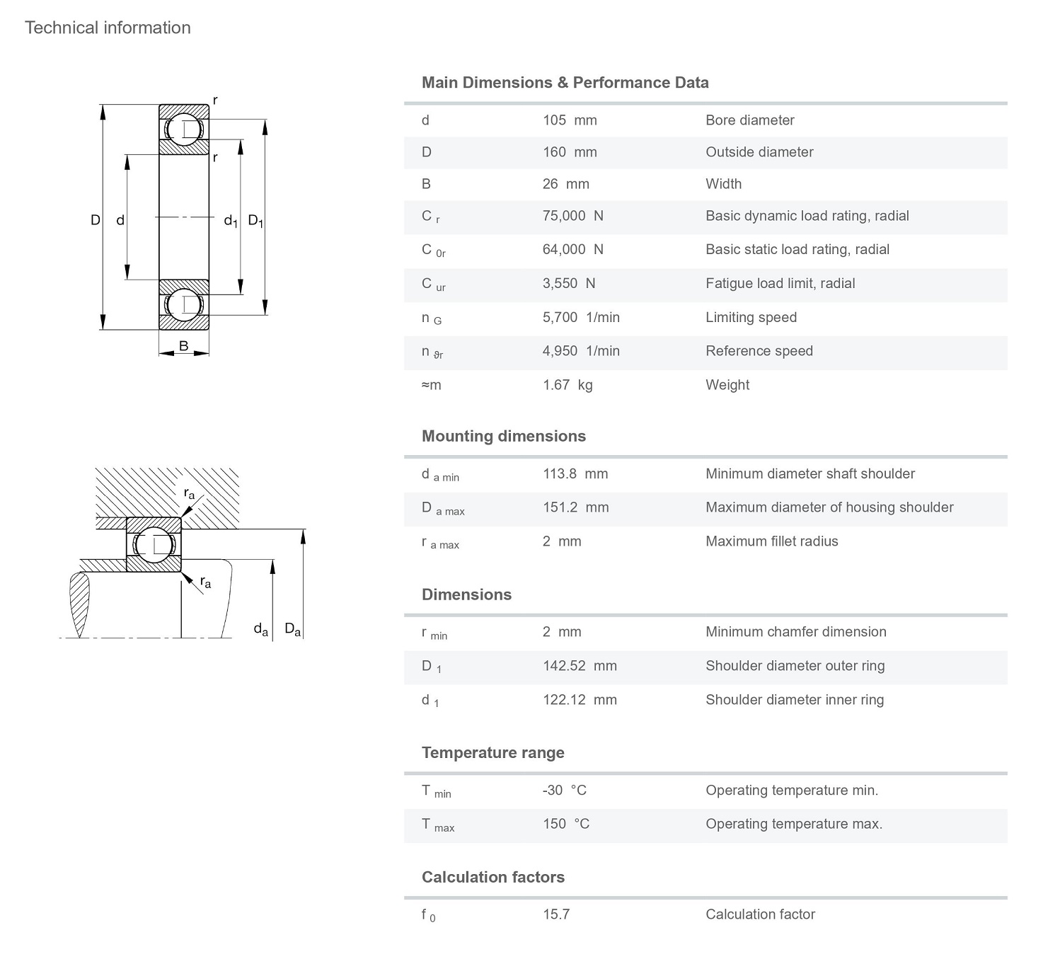 FAG 6021-C4 มีขนาดวงใน 105 มิล วงนอก 160 มิล หนา 26 มิล เป็นตลับลูกปืนเม็ดกลมร่องลึก ไม่มีฝา แถวเดียว รังเหล็ก มีแรงเสียดทานต่ำ เสียงเงียบ สามารถรองรับความเร็วรอบสูง รองรับแรงทั้งแนวรัศมีและแนวแกน