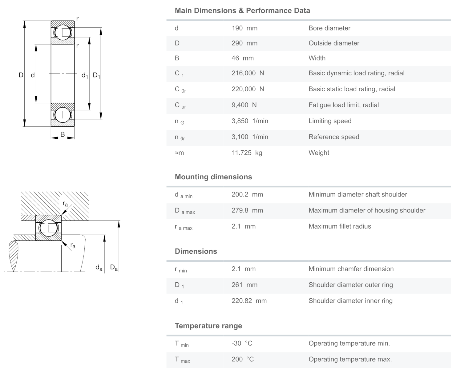 FAG 6038-MA-C3 มีขนาดวงใน 190 มิล วงนอก 290 มิล หนา 46 มิล เป็นตลับลูกปืนเม็ดกลมร่องลึก ไม่มีฝาปิด แถวเดียว รังทองเหลือง มีแรงเสียดทานต่ำ เสียงเงียบ สามารถรองรับความเร็วรอบสูง รองรับแรงทั้งแนวรัศมีและแนวแกน