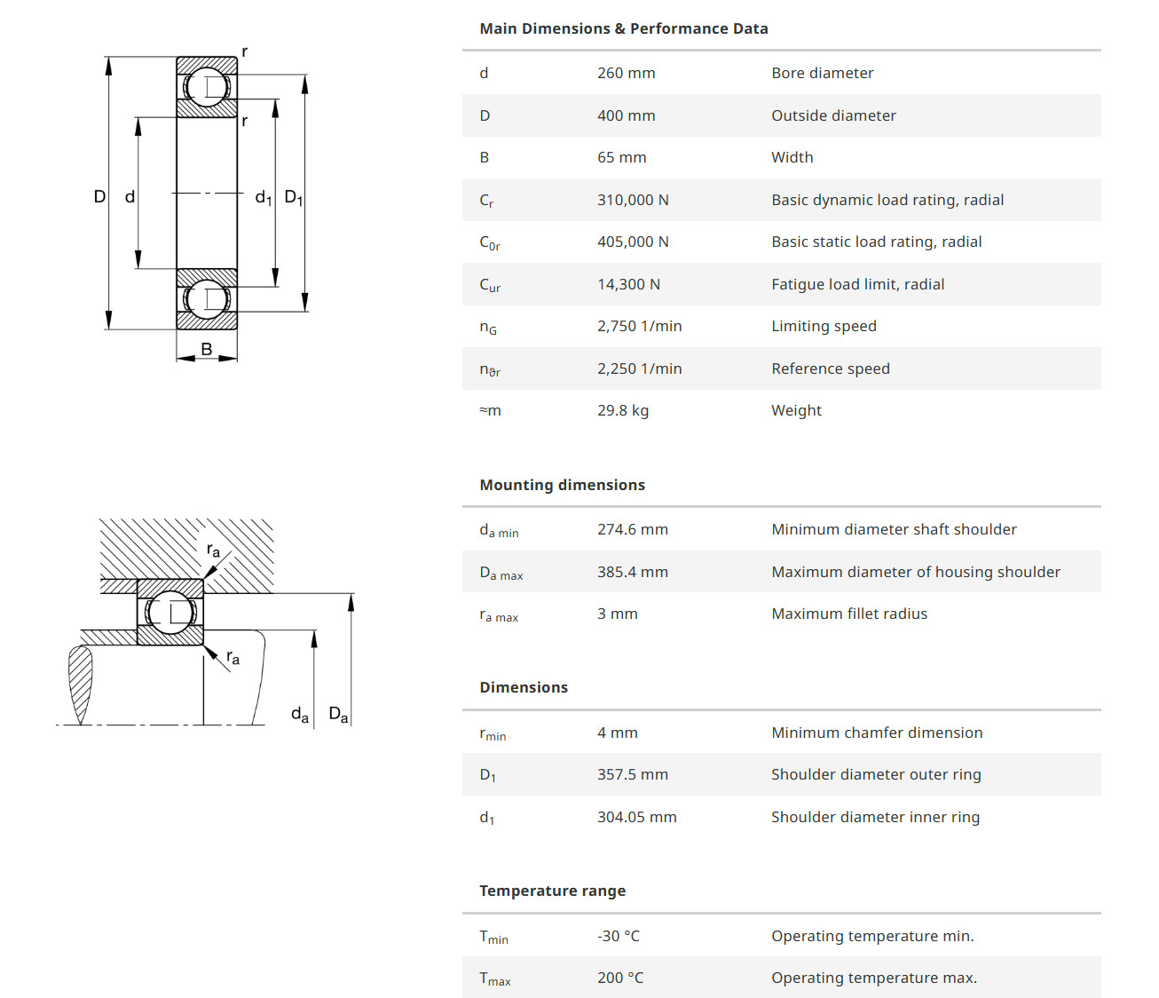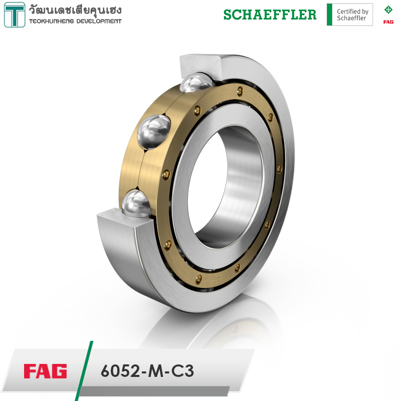 FAG 6052-M-C3 มีขนาดวงใน 260 มิล วงนอก 400 มิล หนา 65 มิล เป็นตลับลูกปืนเม็ดกลมร่องลึก ไม่มีฝา แถวเดียว รังทองเหลือง มีแรงเสียดทานต่ำ เสียงเงียบ สามารถรองรับความเร็วรอบสูง รองรับแรงทั้งแนวรัศมีและแนวแกน