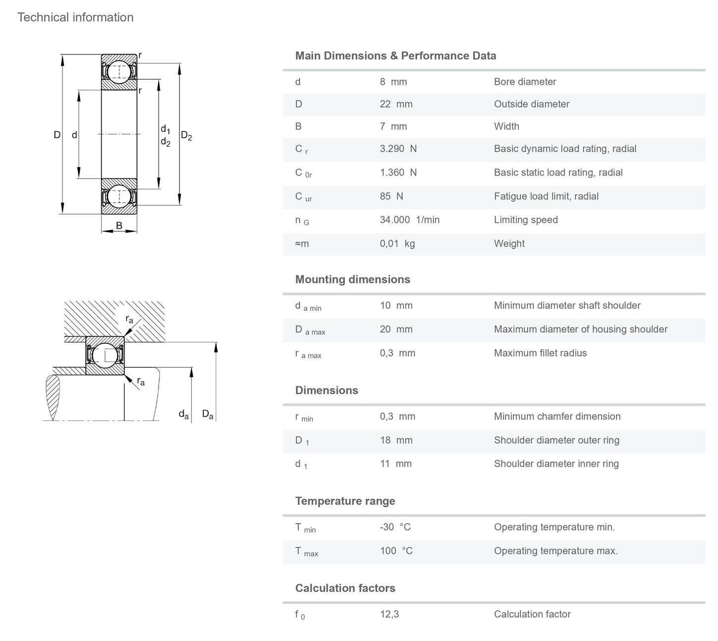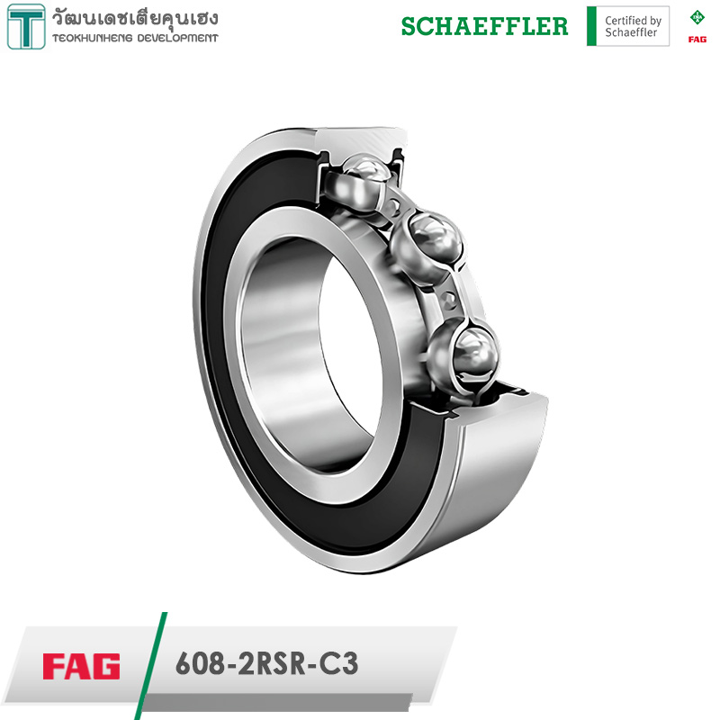 FAG 608-2RSR-C3 มีขนาดวงใน 8 มิล วงนอก 22 มิล หนา 7 มิล เป็นตลับลูกปืนเม็ดกลม แถวเดียว มีฝายางแบบสัมผัสสองด้าน มีแรงเสียดทานต่ำ เสียงเงียบ สามารถรองรับความเร็วรอบสูง รองรับแรงทั้งแนวรัศมีและแนวแกน