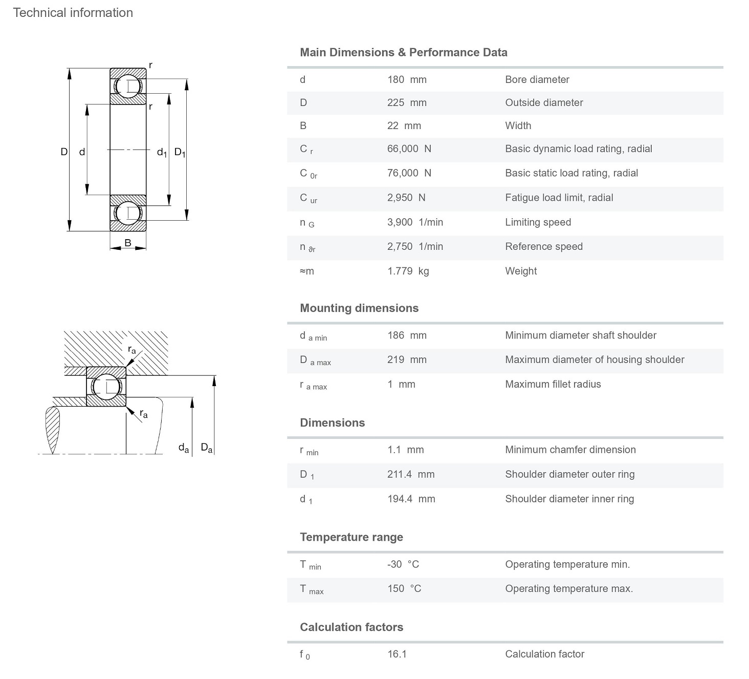 FAG 61836 ตลับลูกปืน ขนาด 180x225x22 Deep Groove Ball Bearing