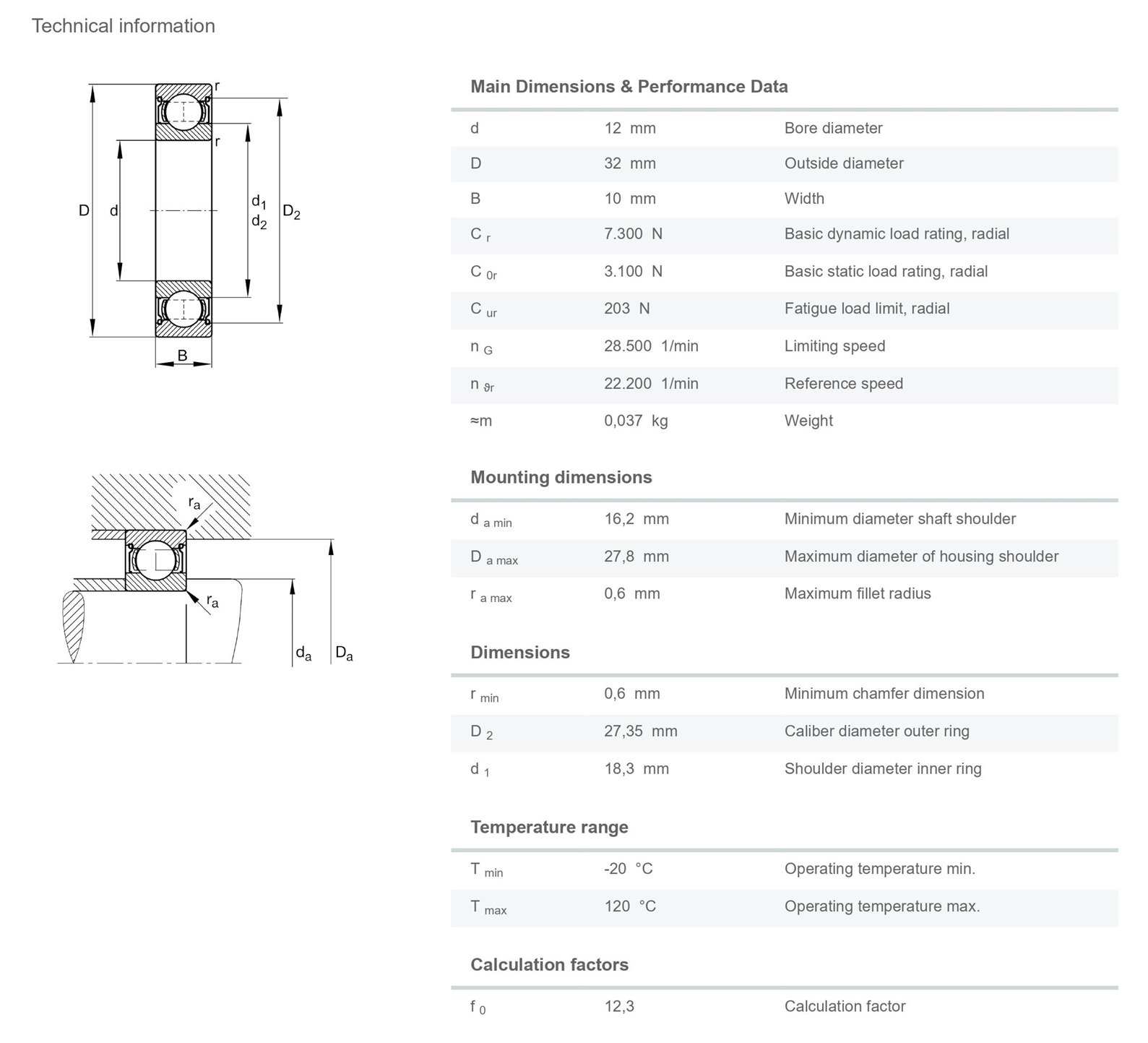 FAG 6201-2Z มีขนาดวงใน 12 มิล วงนอก 32 มิล หนา 10 มิล เป็นตลับลูกปืนเม็ดกลมร่องลึก แถวเดียว ฝาเหล็กสองด้าน มีแรงเสียดทานต่ำ เสียงเงียบ รองรับความเร็วรอบสูง