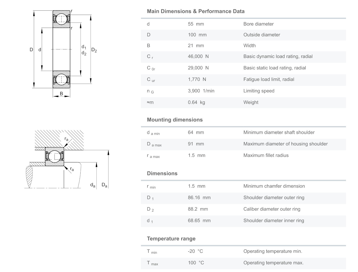 FAG 6211-2RSR-C3 มีขนาดวงใน 55 มิล วงนอก 100 มิล หนา 21 มิล เป็นตลับลูกปืนเม็ดกลมร่องลึก ฝายางสองด้าน แถวเดียว มีแรงเสียดทานต่ำ เสียงเงียบ สามารถรองรับความเร็วรอบสูง รองรับแรงทั้งแนวรัศมีและแนวแกน