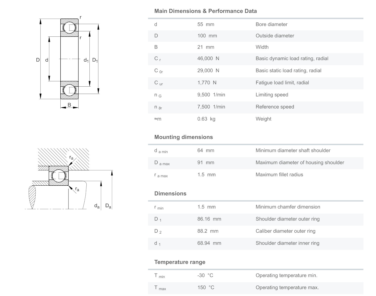 FAG 6211-C3 มีขนาดวงใน 55 มิล วงนอก 100 มิล หนา 21 มิล เป็นตลับลูกปืนเม็ดกลมร่องลึก ไม่มีฝา แถวเดียว มีแรงเสียดทานต่ำ เสียงเงียบ สามารถรองรับความเร็วรอบสูง รองรับแรงทั้งแนวรัศมีและแนวแกน