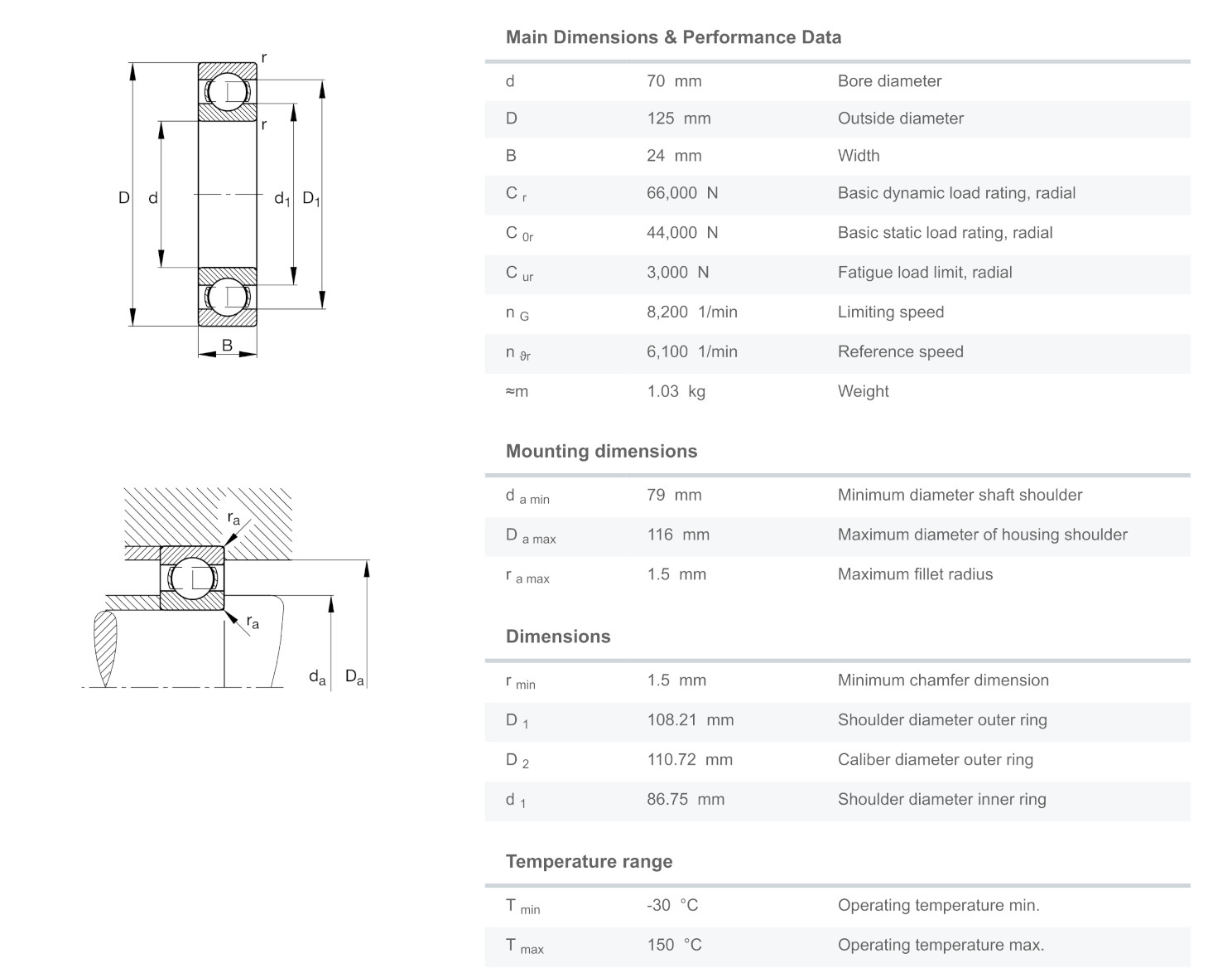 FAG 6214 มีขนาดวงใน 70 มิล วงนอก 125 มิล หนา 24 มิล เป็นตลับลูกปืนเม็ดกลมร่องลึก ไม่มีฝา แถวเดียว มีแรงเสียดทานต่ำ เสียงเงียบ สามารถรองรับความเร็วรอบสูง รองรับแรงทั้งแนวรัศมีและแนวแกน