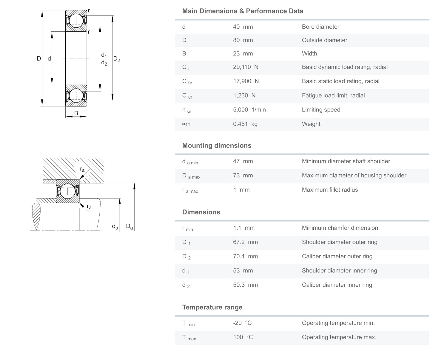 FAG 62208-A-2RSR มีขนาดวงใน 40 มิล วงนอก 80 มิล หนา 23 มิล เป็นตลับลูกปืนเม็ดกลมร่องลึก ฝายางสองด้าน แถวเดียว มีแรงเสียดทานต่ำ เสียงเงียบ สามารถรองรับความเร็วรอบสูง รองรับแรงทั้งแนวรัศมีและแนวแกน