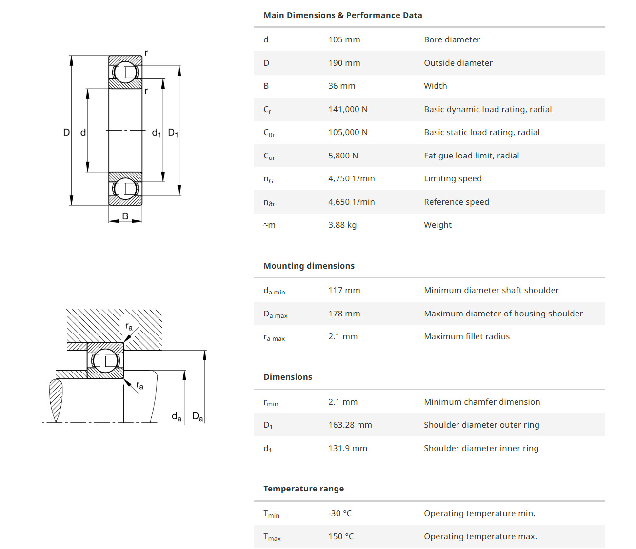 FAG 6221 มีขนาดวงใน 105 มิล วงนอก 190 มิล หนา 36 มิล เป็นตลับลูกปืนเม็ดกลมร่องลึก ไม่มีฝาปิด แถวเดียว รังเหล็ก มีแรงเสียดทานต่ำ เสียงเงียบ สามารถรองรับความเร็วรอบสูง รองรับแรงทั้งแนวรัศมีและแนวแกน