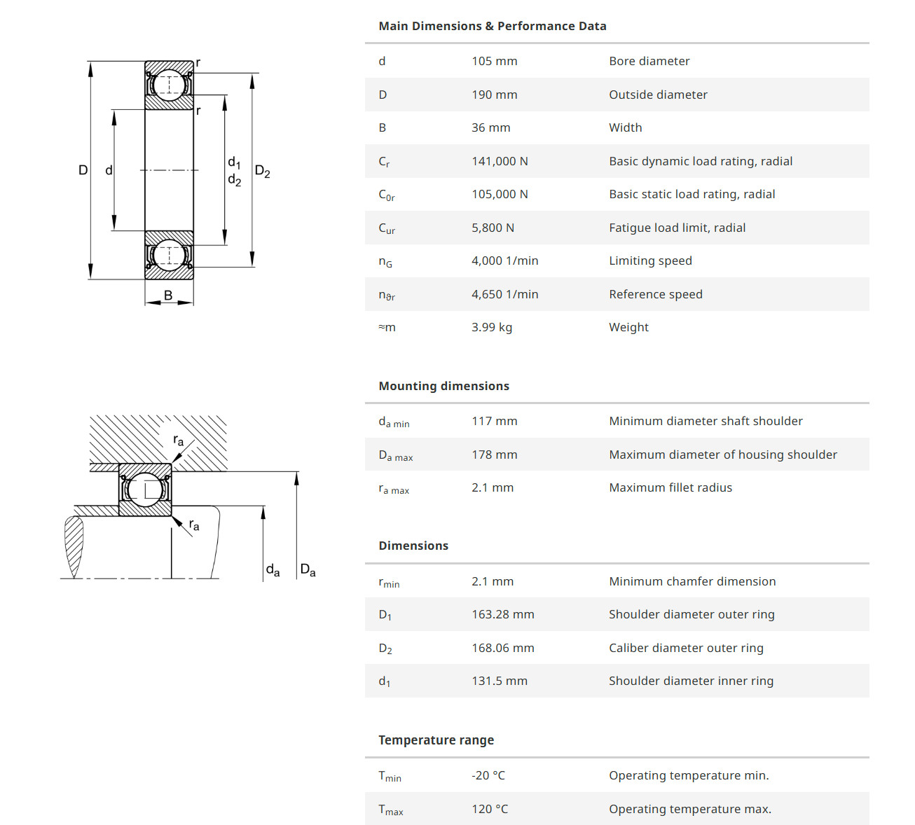 FAG 6221-2Z มีขนาดวงใน 105 มิล วงนอก 190 มิล หนา 36 มิล เป็นตลับลูกปืนเม็ดกลมร่องลึก มีฝาเหล็กสองด้าน แถวเดียว รังเหล็ก มีแรงเสียดทานต่ำ เสียงเงียบ สามารถรองรับความเร็วรอบสูง รองรับแรงทั้งแนวรัศมีและแนวแกน