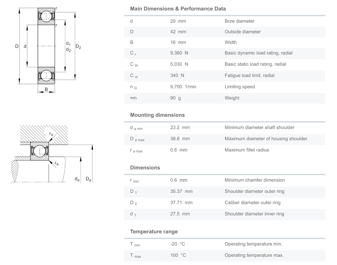 FAG 63004-A-2RSR มีขนาดวงใน 20 มิล วงนอก 42 มิล หนา 16 มิล เป็นตลับลูกปืนเม็ดกลมร่องลึก มีฝายางปิดสองด้าน แถวเดียว มีแรงเสียดทานต่ำ เสียงเงียบ สามารถรองรับความเร็วรอบสูง รองรับแรงทั้งแนวรัศมีและแนวแกน