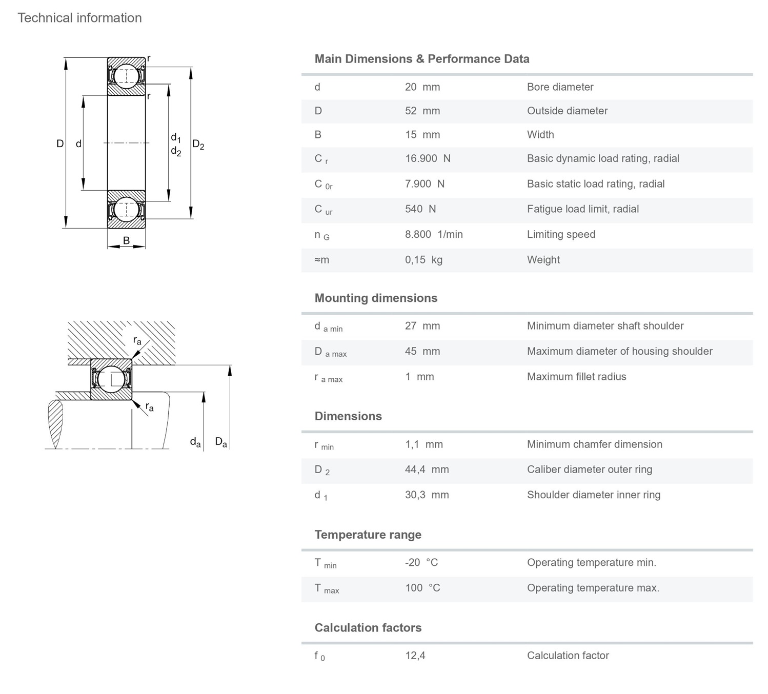 FAG 6304-2RSR มีขนาดวงใน 20 มิล วงนอก 52 มิล หนา 15 มิล เป็นตลับลูกปืนเม็ดกลมร่องลึก แถวเดียว รังเหล็ก มีฝายางสองด้าน มีแรงเสียดทานต่ำ เสียงเงียบ สามารถรองรับความเร็วรอบสูง รองรับแรงทั้งแนวรัศมีและแนวแกน