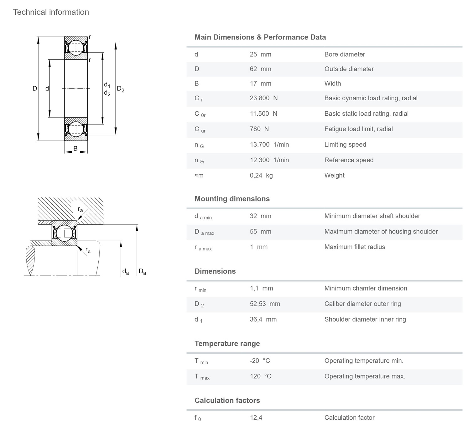 FAG 6305-2Z-C3 ตลับลูกปืนขนาด 25x62x17 Deep Groove Ball Bearing