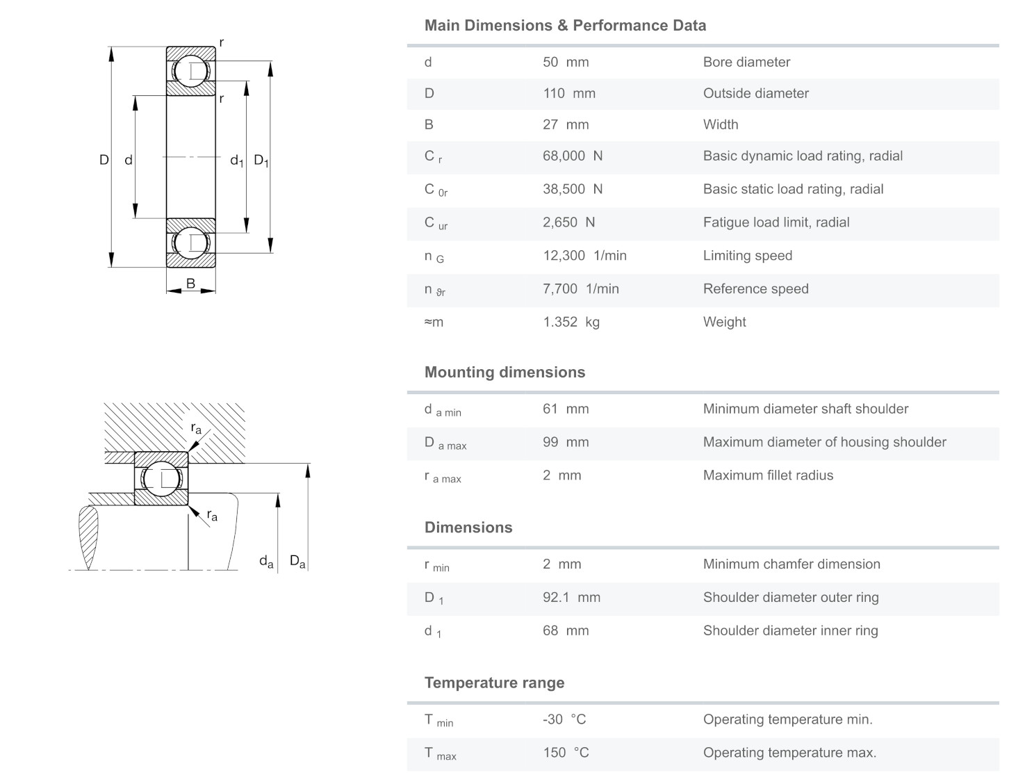 FAG 6310-M-C3 มีขนาดวงใน 50 มิล วงนอก 110 มิล หนา 27 มิล เป็นตลับลูกปืนเม็ดกลมร่องลึก ไม่มีฝา แถวเดียว รังทองเหลือง มีแรงเสียดทานต่ำ เสียงเงียบ สามารถรองรับความเร็วรอบสูง รองรับแรงทั้งแนวรัศมีและแนวแกน
