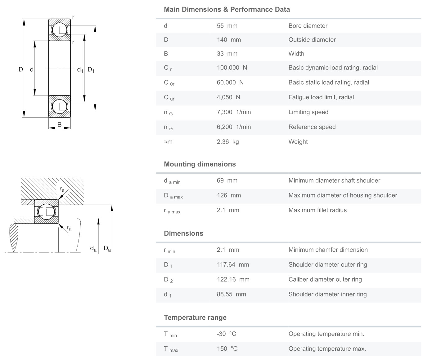 FAG 6411-C3 มีขนาดวงใน 55 มิล วงนอก 140 มิล หนา 33 มิล เป็นตลับลูกปืนเม็ดกลมร่องลึก รังเหล็ก ไม่มีฝา แถวเดียว มีแรงเสียดทานต่ำ เสียงเงียบ สามารถรองรับความเร็วรอบสูง รองรับแรงทั้งแนวรัศมีและแนวแกน