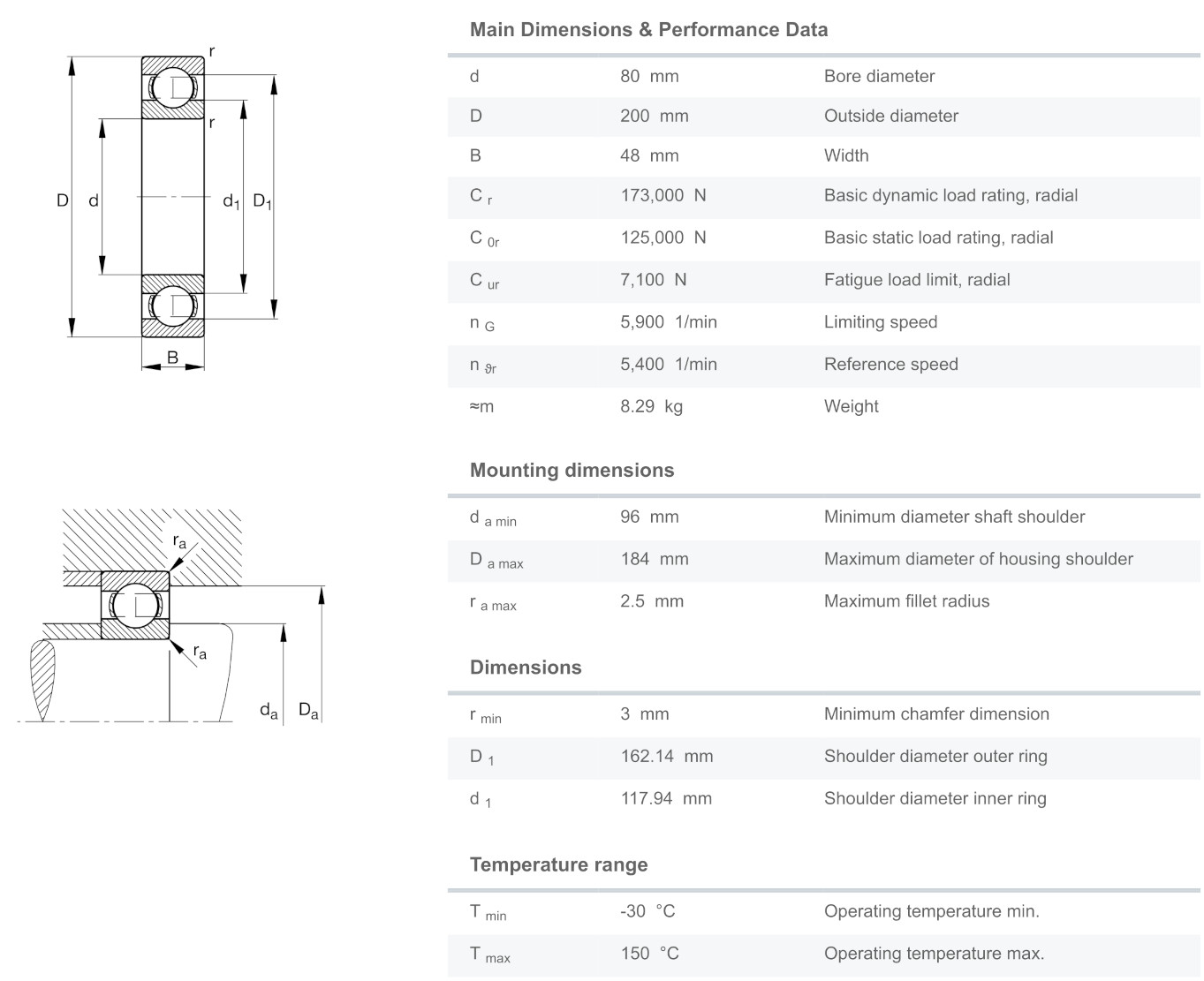 FAG 6416-M มีขนาดวงใน 80 มิล วงนอก 200 มิล หนา 48 มิล เป็นตลับลูกปืนเม็ดกลมร่องลึก รังทองเหลือง ไม่มีฝา แถวเดียว มีแรงเสียดทานต่ำ เสียงเงียบ สามารถรองรับความเร็วรอบสูง รองรับแรงทั้งแนวรัศมีและแนวแกน