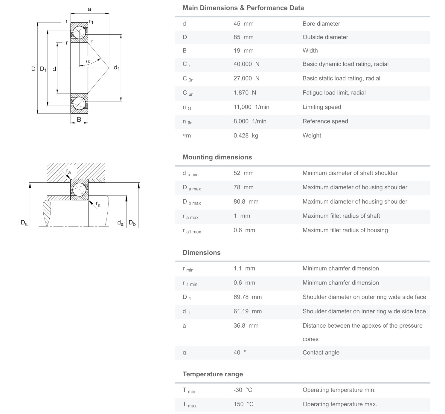 FAG 7209-B-XL-JP มีขนาดวงใน 45 มิล วงนอก 85 มิล หนา 19 มิล เป็นตลับลูกปืนเม็ดกลมแบบมุมสัมผัส 40 องศา แถวเดียว ไม่มีฝาปิด รังเหล็ก รองรับแรงโหลดได้ทั้งในแนวรัศมีและแนวแกนพร้อมๆ กันได้ดี