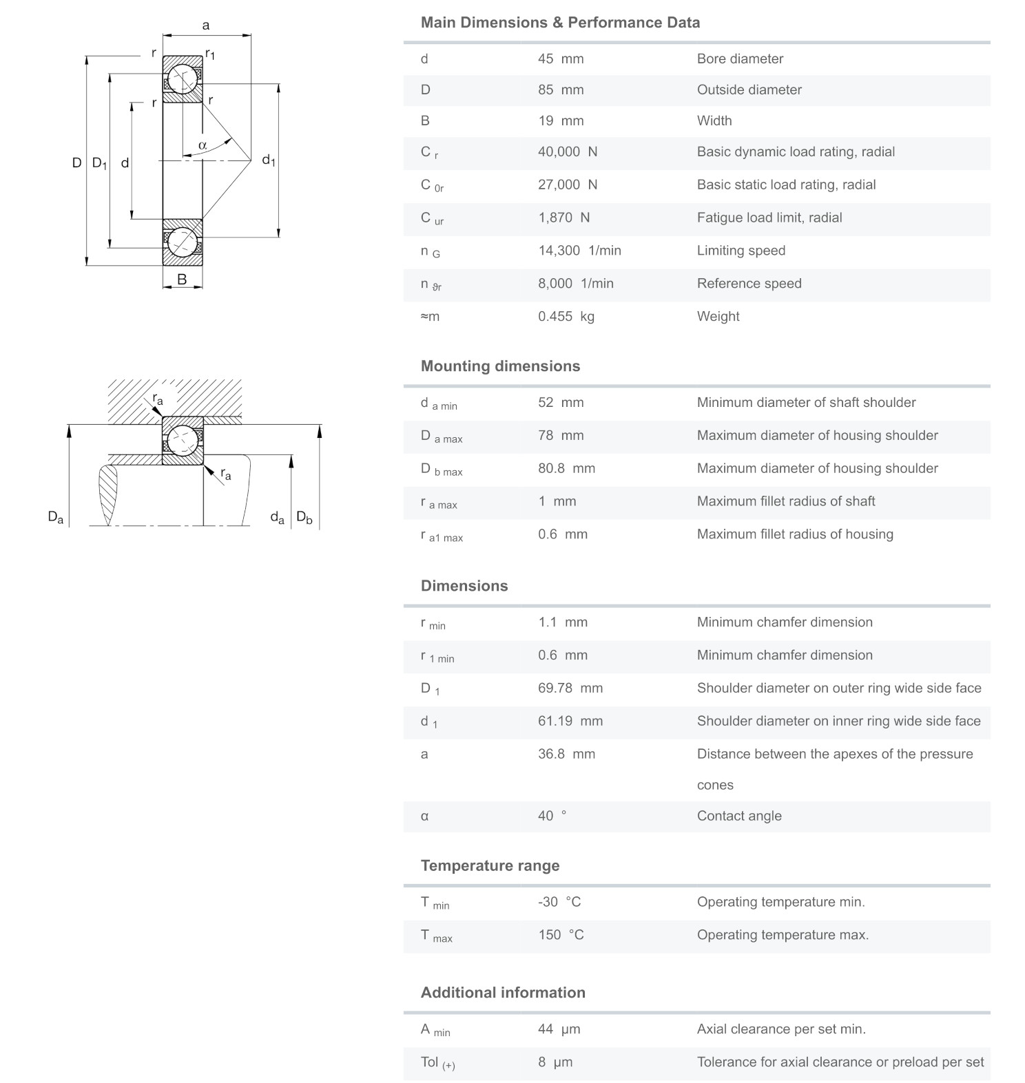FAG 7209-B-XL-MP-UA มีขนาดวงใน 45 มิล วงนอก 85 มิล หนา 19 มิล เป็นตลับลูกปืนเม็ดกลมแบบมุมสัมผัส 40 องศา แถวเดียว ไม่มีฝาปิด รังทองเหลือง รุ่นเหมาะสำหรับใช้งานแบบประกบคู่ รองรับแรงโหลดได้ทั้งในแนวรัศมีและแนวแกนพร้อมๆ กันได้ดี