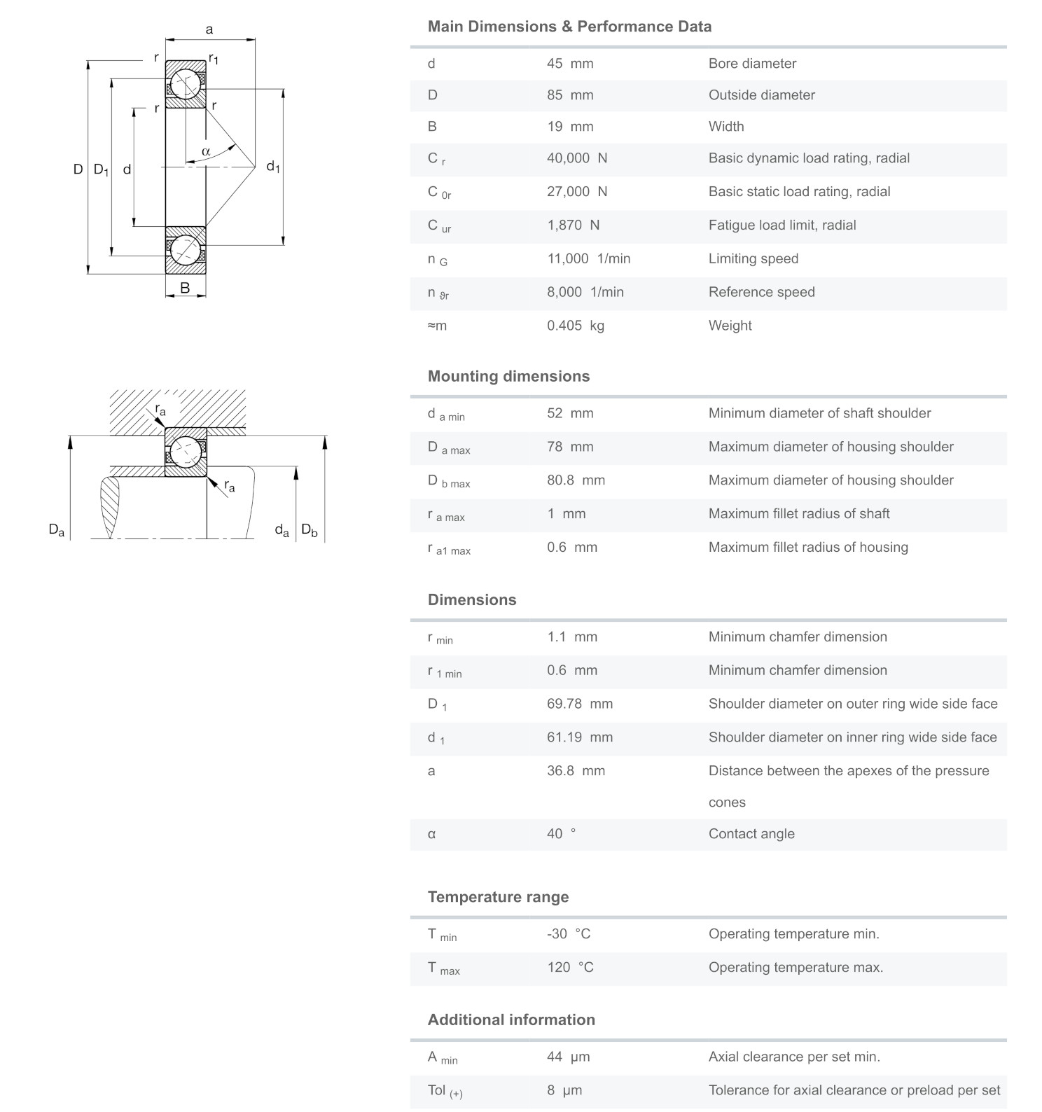 FAG 7209-B-XL-TVP-UA มีขนาดวงใน 45 มิล วงนอก 85 มิล หนา 19 มิล เป็นตลับลูกปืนเม็ดกลมแบบมุมสัมผัส 40 องศา แถวเดียว ไม่มีฝาปิด รังโพลีเอไมด์ รุ่นเหมาะสำหรับใช้งานแบบประกบคู่ รองรับแรงโหลดได้ทั้งในแนวรัศมีและแนวแกนพร้อมๆ กันได้ดี