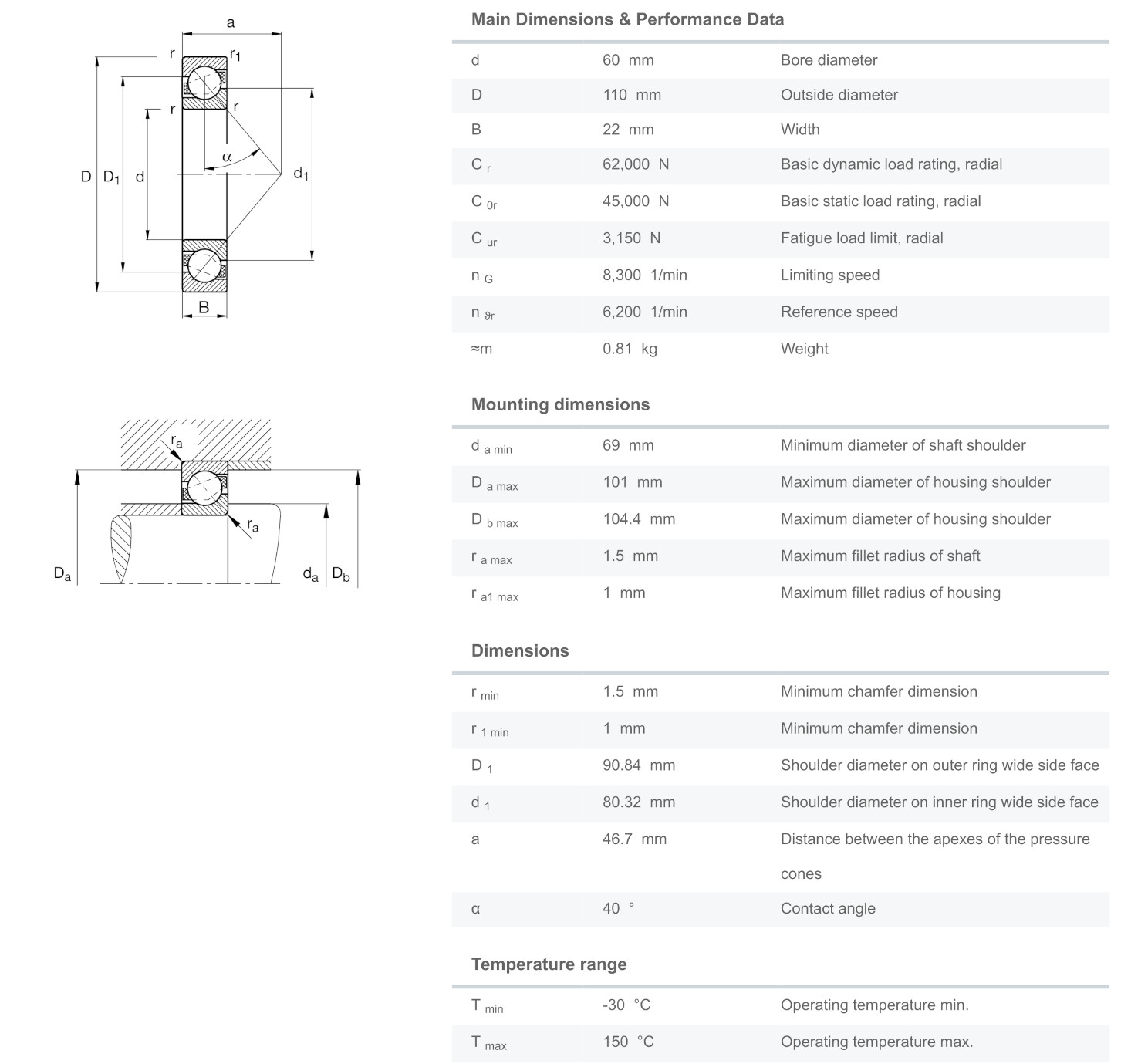 FAG 7212-B-JP มีขนาดวงใน 60 มิล วงนอก 110 มิล หนา 22 มิล เป็นตลับลูกปืนเม็ดกลมแบบมุมสัมผัส 40 องศา แถวเดียว ไม่มีฝาปิด รังเหล็ก รองรับแรงโหลดได้ทั้งในแนวรัศมีและแนวแกนพร้อมๆ กันได้ดี