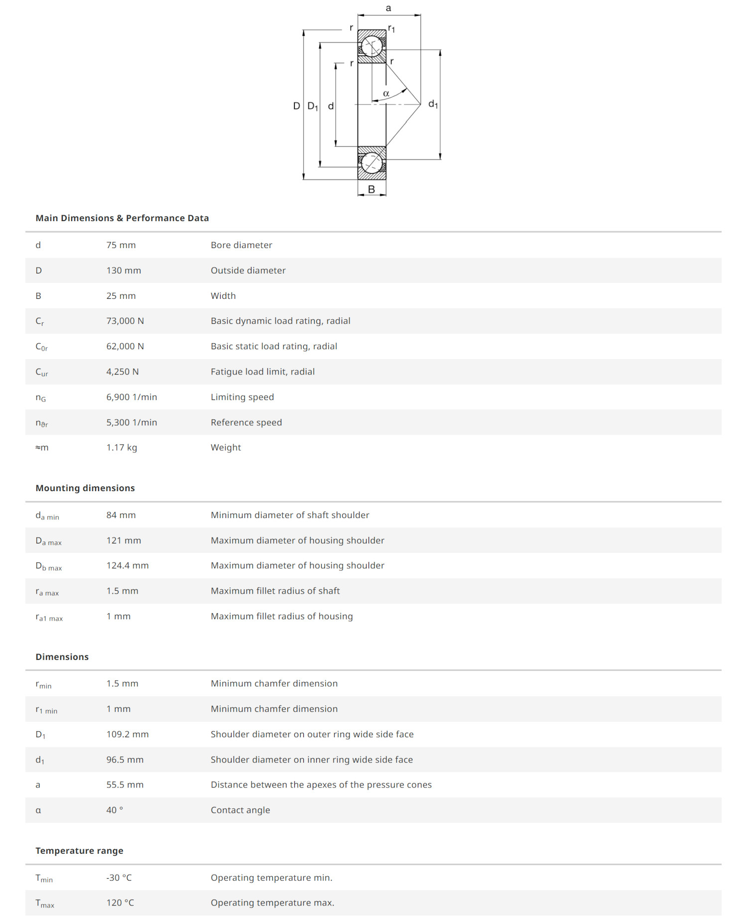 FAG 7215-B-XL-TVP มีขนาดวงใน 75 มิล วงนอก 130 มิล หนา 25 มิล เป็นตลับลูกปืนเม็ดกลมแบบมุมสัมผัส 40 องศา แถวเดียว รังโพลีเอไมด์ รองรับแรงโหลดได้ทั้งในแนวรัศมีและแนวแกนพร้อมๆ กันได้ดี