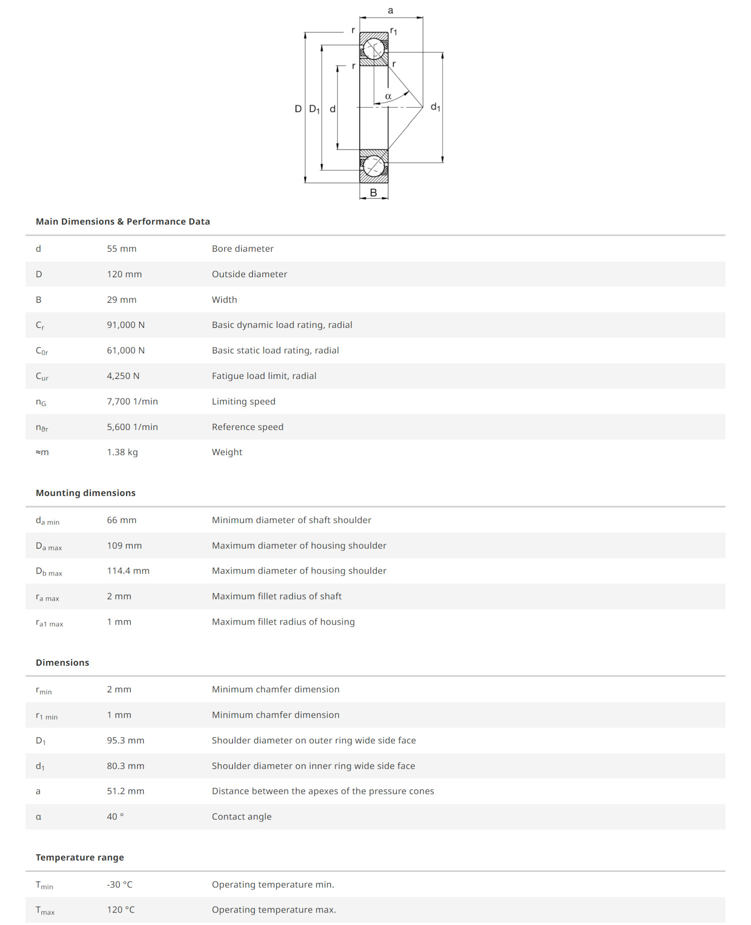FAG 7311-B-XL-TVP มีขนาดวงใน 55 มิล วงนอก 120 มิล หนา 29 มิล เป็นตลับลูกปืนเม็ดกลมแบบมุมสัมผัส 40 องศา แถวเดียว ไม่มีฝาปิด รังโพลีอาไมด์ รองรับแรงโหลดได้ทั้งในแนวรัศมีและแนวแกนพร้อมๆ กันได้ดี