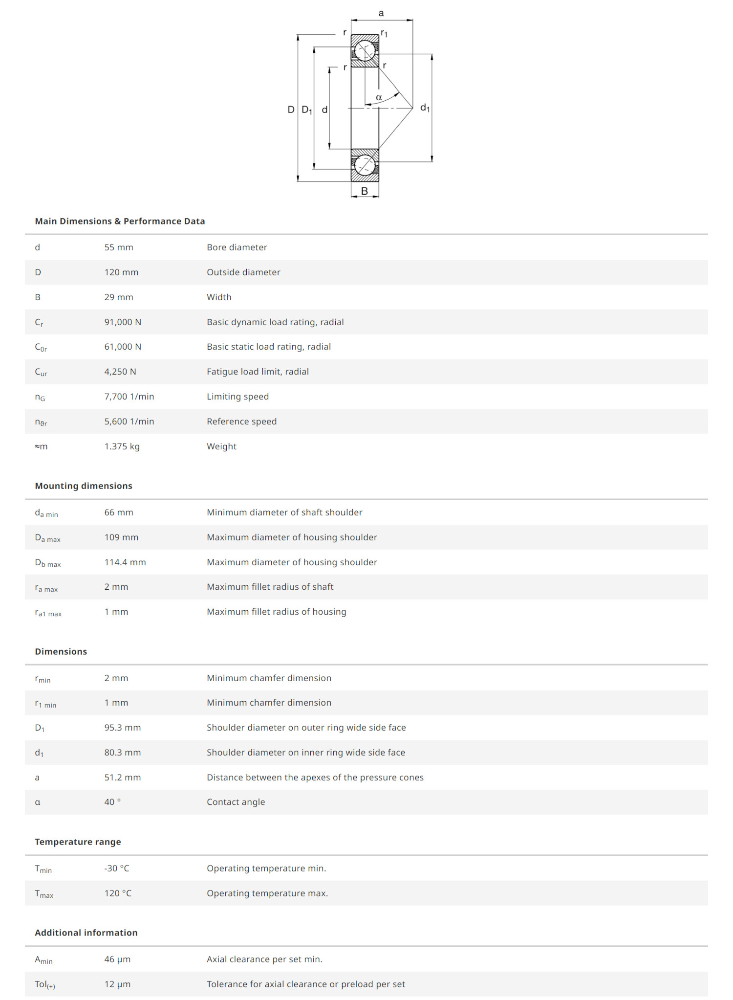 FAG 7311-B-XL-TVP-UA มีขนาดวงใน 55 มิล วงนอก 120 มิล หนา 29 มิล เป็นตลับลูกปืนเม็ดกลมแบบมุมสัมผัส 40 องศา แถวเดียว ไม่มีฝาปิด รังโพลีอาไมด์ รุ่นสำหรับติดตั้งแบบประกบคู่ รองรับแรงโหลดได้ทั้งในแนวรัศมีและแนวแกนพร้อมๆ กันได้ดี