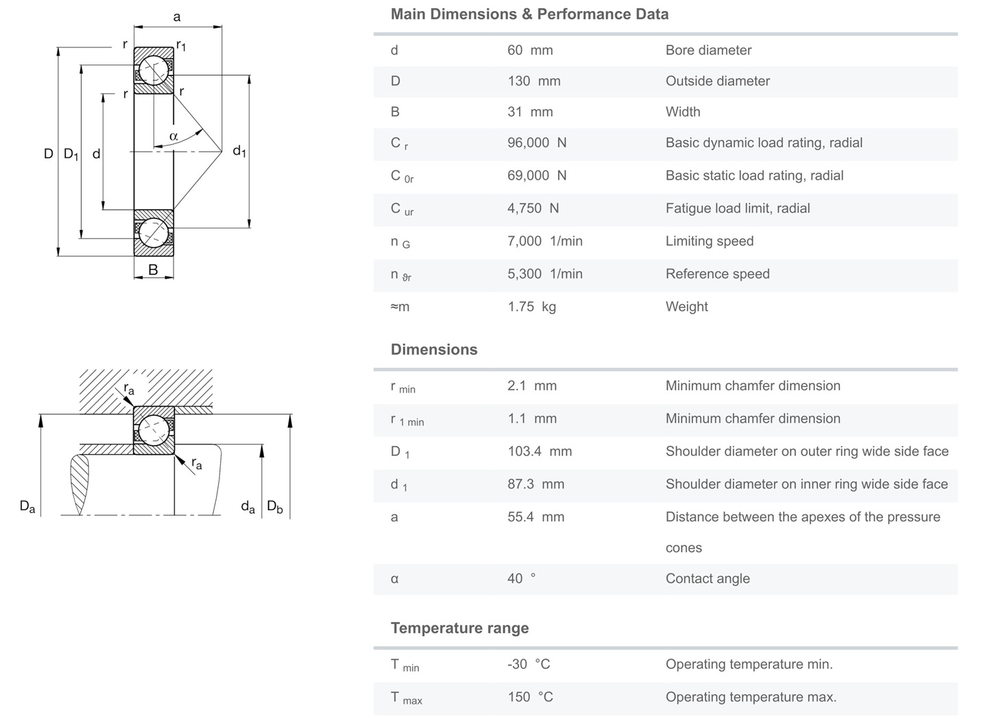 FAG 7312-B-XL-JP-UA มีขนาดวงใน 60 มิล วงนอก 130 มิล หนา 31 มิล เป็นตลับลูกปืนเม็ดกลมแบบมุมสัมผัส 40 องศา แถวเดียว ไม่มีฝาปิด รังเหล็ก เหมาะสำหรับประกบคู่ รองรับแรงโหลดได้ทั้งในแนวรัศมีและแนวแกนพร้อมๆ กันได้ดี
