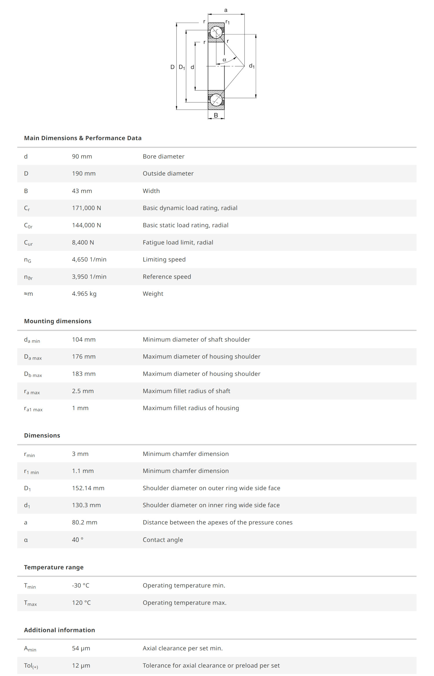 FAG 7318-B-XL-TVP-UA มีขนาดวงใน 90 มิล วงนอก 190 มิล หนา 43 มิล เป็นตลับลูกปืนเม็ดกลมแบบมุมสัมผัส 40 องศา แถวเดียว รังโพลีเอไมด์ รุ่นสำหรับติดตั้งแบบประกบคู่ รองรับแรงโหลดได้ทั้งในแนวรัศมีและแนวแกนพร้อมๆ กันได้ดี