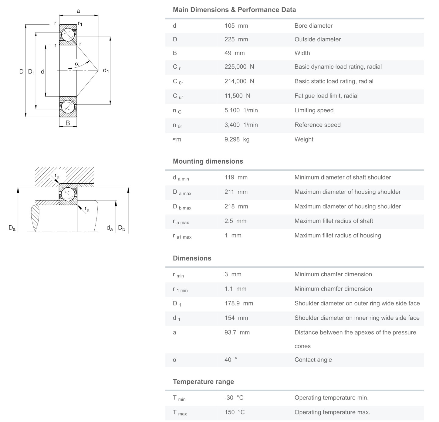 FAG 7321-B-XL-MP-UA มีขนาดวงใน 105 มิล วงนอก 225 มิล หนา 49 มิล เป็นตลับลูกปืนเม็ดกลมแบบมุมสัมผัส 40 องศา แถวเดียว ไม่มีฝาปิด รังทองเหลือง เหมาะสำหรับประกบคู่ รองรับแรงโหลดได้ทั้งในแนวรัศมีและแนวแกนพร้อมๆ กันได้ดี