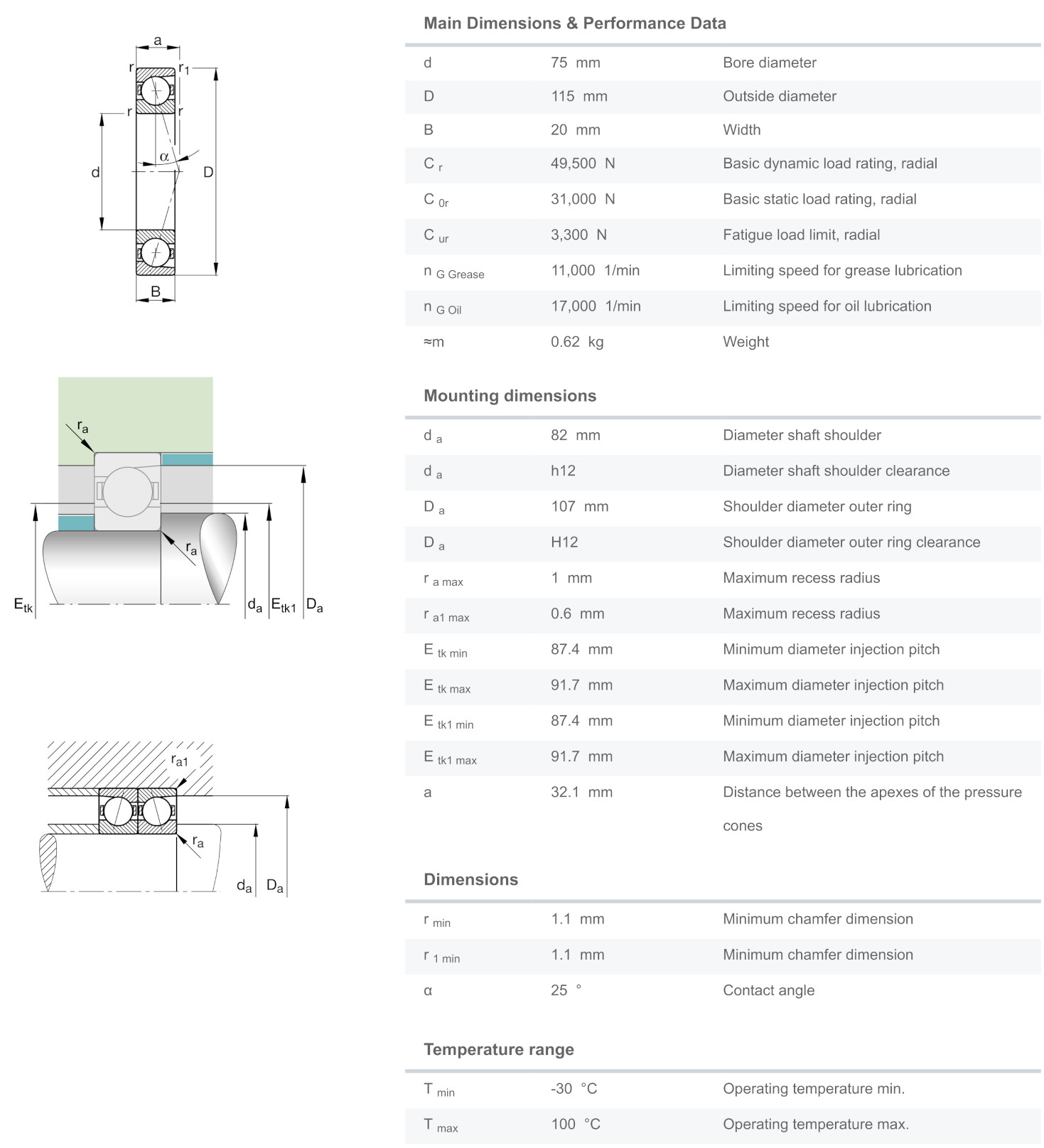 FAG B7015-E-T-P4S-UL มีขนาดวงใน 75 มิล วงนอก 115 มิล หนา 20 มิล เป็นตลับลูกปืนความเที่ยงตรงสูงเม็ดกลมแบบมุมสัมผัส 25° องศา มีค่าความแม่นยำ Class4S รองรับความเร็วรอบได้สูงมาก
