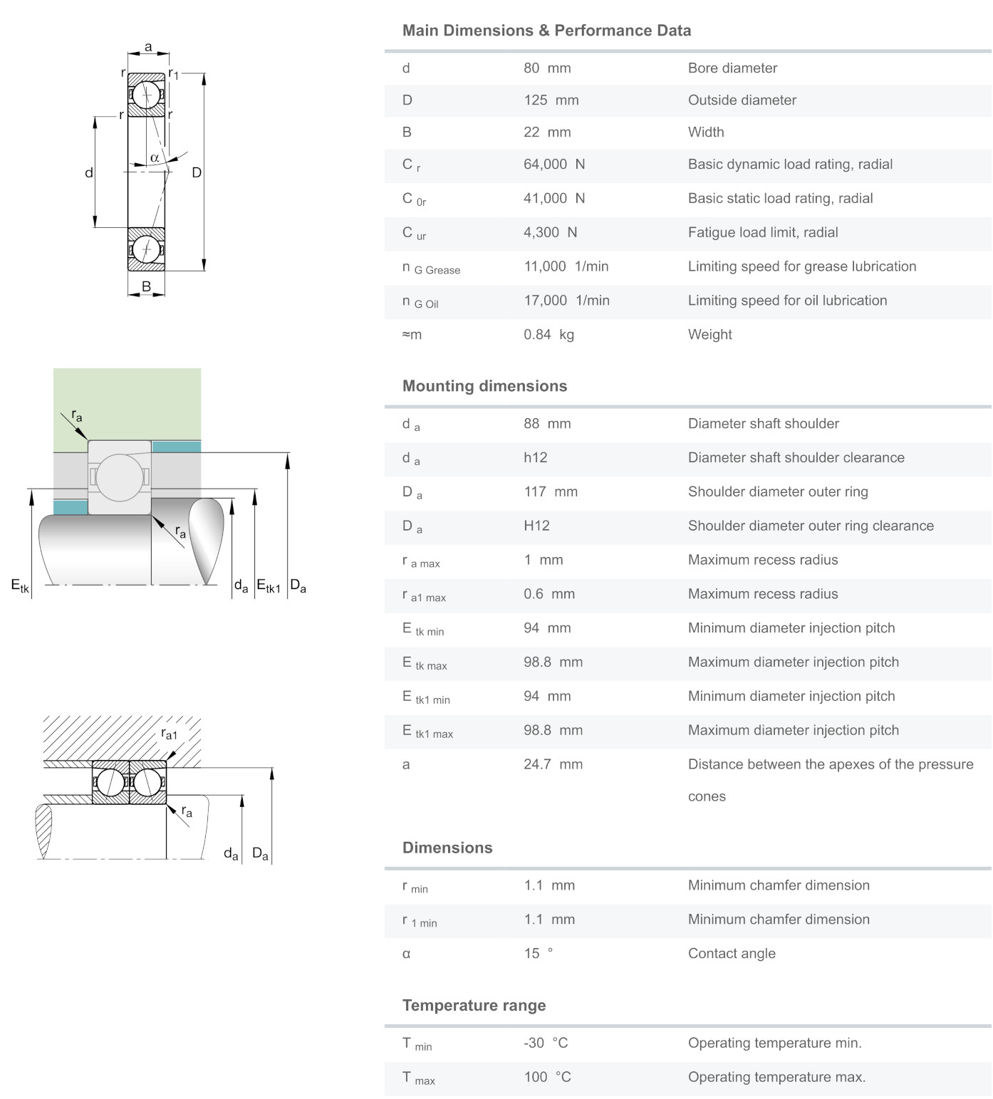 FAG B7016-C-T-P4S-UL มีขนาดวงใน 80 มิล วงนอก 125 มิล หนา 22 มิล เป็นตลับลูกปืนความเที่ยงตรงสูงเม็ดกลมแบบมุมสัมผัส 15° องศา มีค่าความแม่นยำ Class4S รองรับความเร็วรอบได้สูงมาก