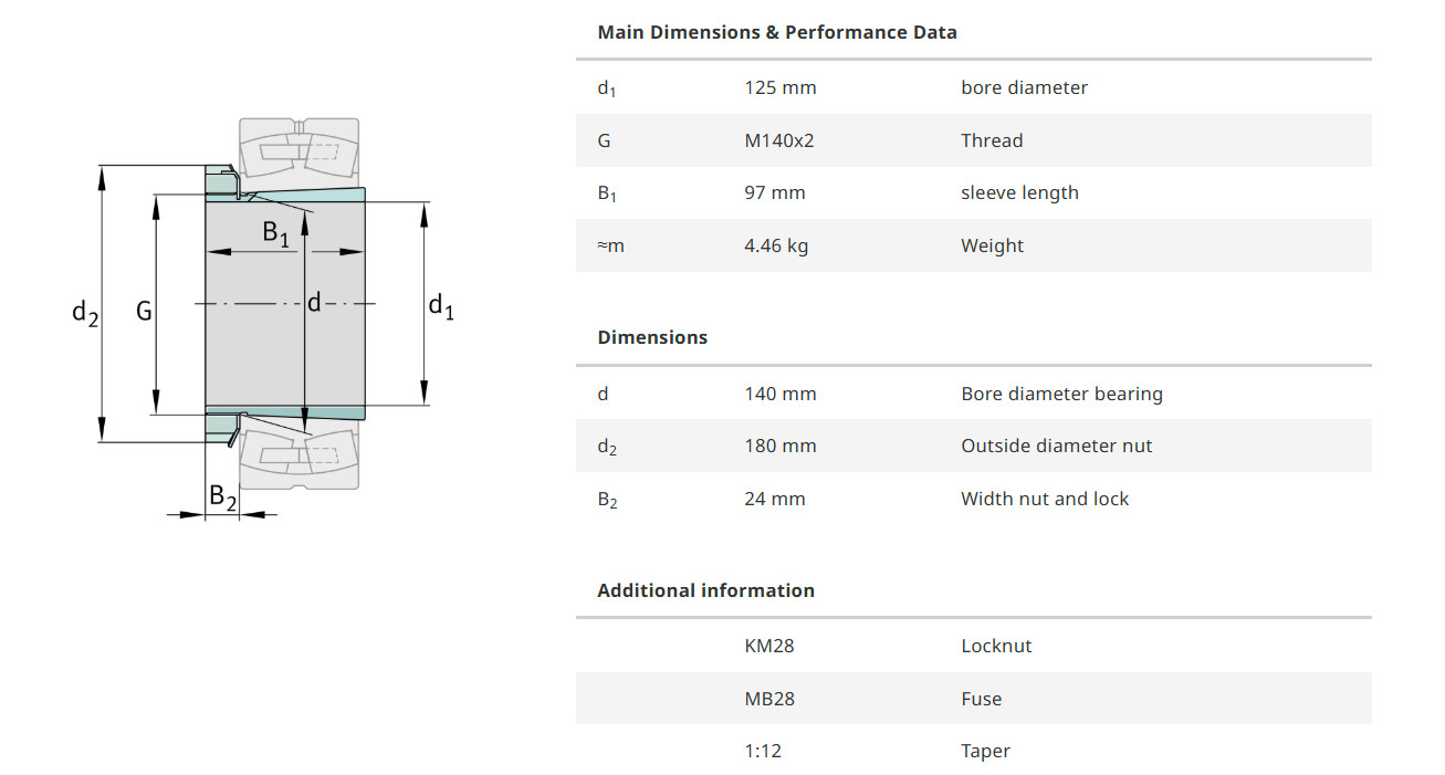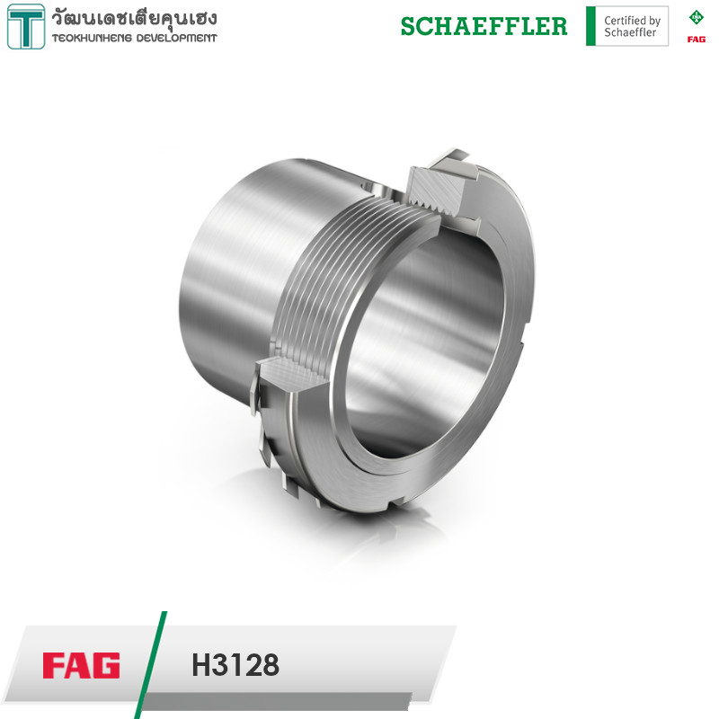 FAG H3128 เป็นอุปกรณ์ปลอกปรับขนาดเพลาหน่วยเมตริก สำหรับใช้กับตลับลูกปืนแกนในรูเรียว (Tapered) ที่สวมกับเพลาทรงกระบอก ในชุดมาพร้อมกับแหวนล็อค (Locknuts) และแหวนจักร (Lock Washer)