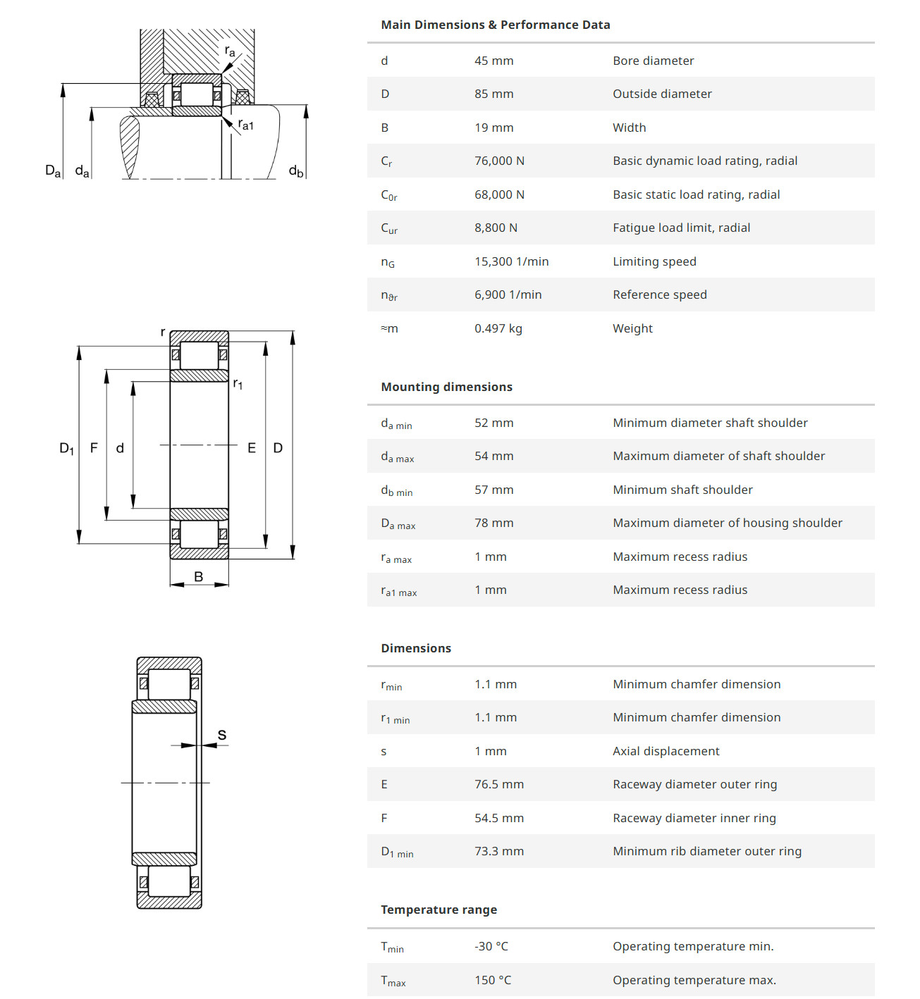 FAG NJ209-E-XL-M1 มีขนาดวงใน 45 มิล วงนอก 85 มิล หนา 19 มิล เป็นตลับลูกปืนเม็ดทรงกระบอก แกนในสามารถถอดหลุดออกได้ด้านเดียว ทำให้สะดวกต่อการติดตั้ง รองรับแรงโหลดได้สูงมาก