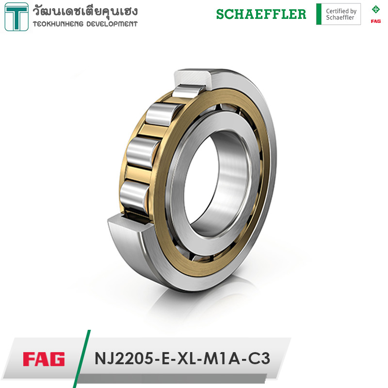 FAG NJ2205-E-XL-M1A-C3 มีขนาดวงใน 25 มิล วงนอก 52 มิล หนา 18 มิล เป็นตลับลูกปืนเม็ดทรงกระบอกแถวเดียว NJ Design มีลักษณะแกนในที่สามารถถอดหลุดออกได้ 1 ด้าน ทำให้สะดวกต่อการติดตั้ง รองรับแรงโหลดได้สูงมาก