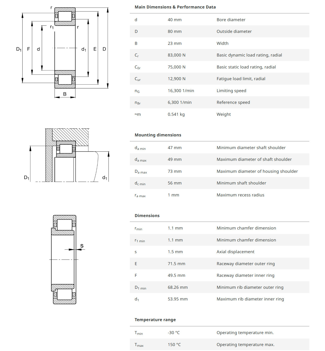FAG NJ2208-E-XL-M1-C3 มีขนาดวงใน 40 มิล วงนอก 80 มิล หนา 23 มิล เป็นตลับลูกปืนเม็ดทรงกระบอก แกนในสามารถถอดหลุดออกได้ด้านเดียว ทำให้สะดวกต่อการติดตั้ง รองรับแรงโหลดได้สูงมาก แบริ่งอุตสาหกรรม