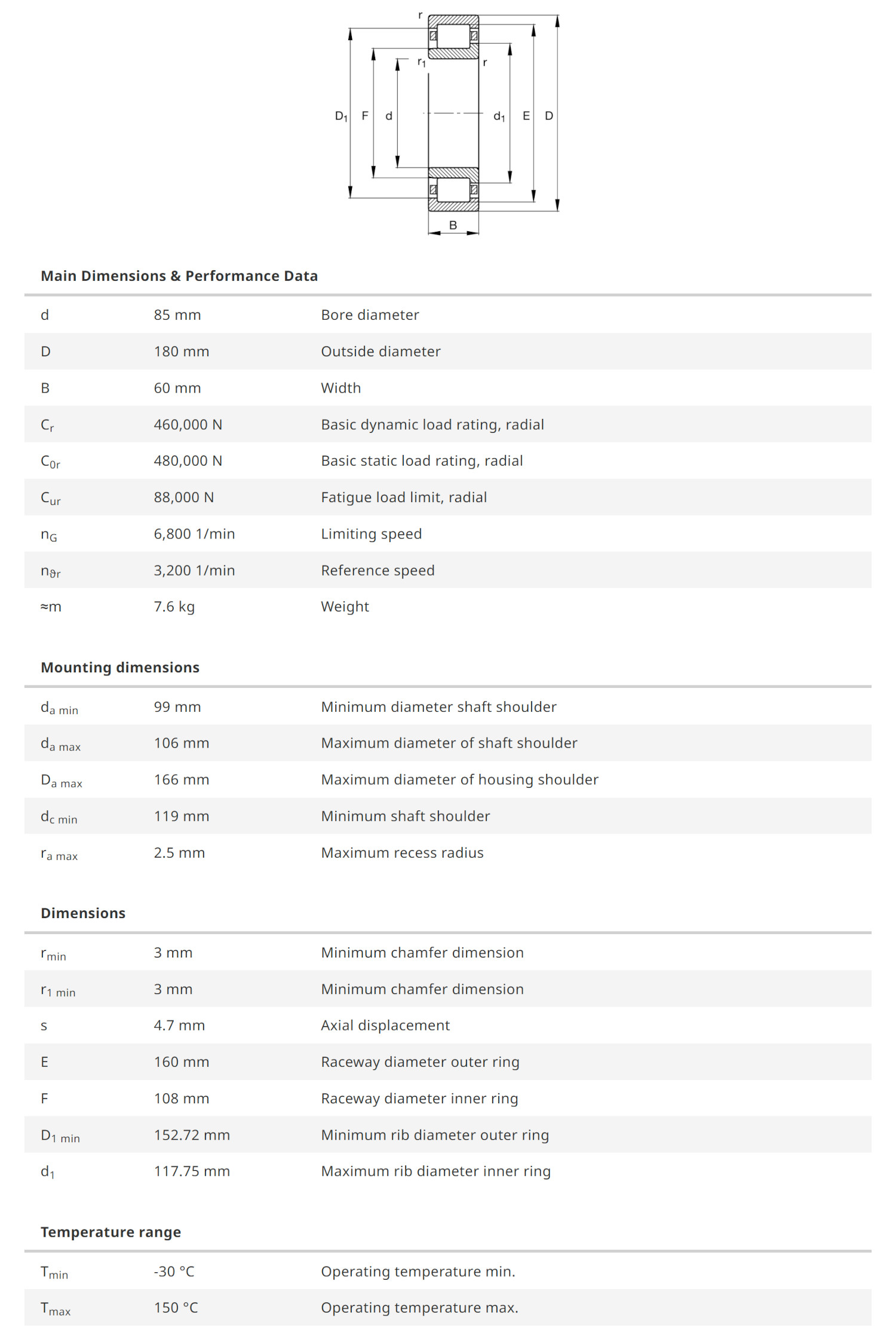 FAG NJ2317-E-XL-M1 มีขนาดวงใน 85 มิล วงนอก 180 มิล หนา 60 มิล เป็นตลับลูกปืนเม็ดทรงกระบอก แกนในสามารถถอดหลุดออกได้ด้านเดียว ทำให้สะดวกต่อการติดตั้ง รองรับแรงโหลดได้สูงมาก