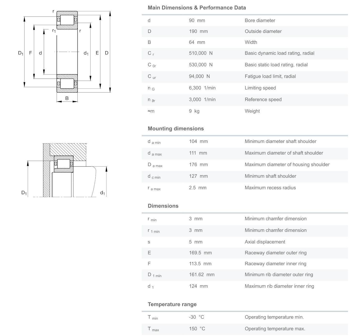 FAG NJ2318-E-XL-M1-C3 มีขนาดวงใน 90 มิล วงนอก 190 มิล หนา 64 มิล เป็นตลับลูกปืนเม็ดทรงกระบอก แกนในสามารถถอดหลุดออกได้ด้านเดียว ทำให้สะดวกต่อการติดตั้ง รองรับแรงโหลดได้สูงมาก