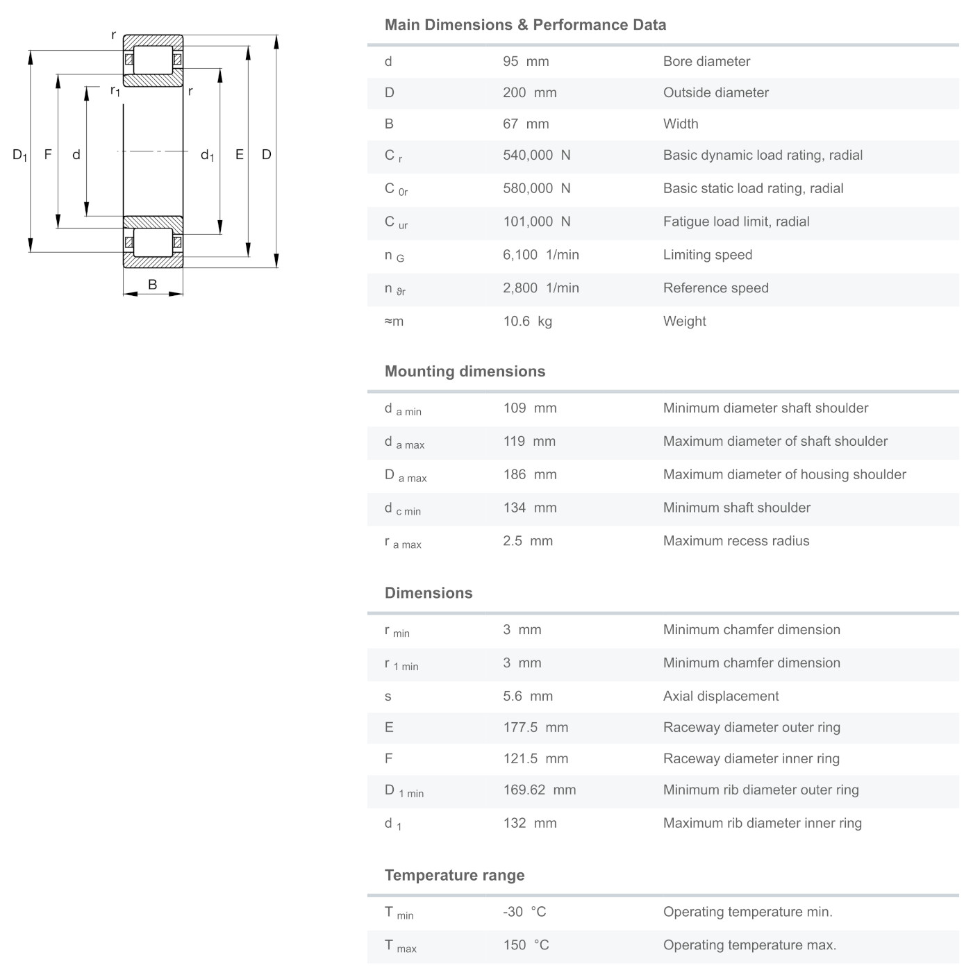 FAG NJ2319-E-XL-M1A-C4 มีขนาดวงใน 95 มิล วงนอก 200 มิล หนา 67 มิล เป็นตลับลูกปืนเม็ดทรงกระบอก แกนในสามารถถอดหลุดออกได้ด้านเดียว ทำให้สะดวกต่อการติดตั้ง รองรับแรงโหลดได้สูงมาก