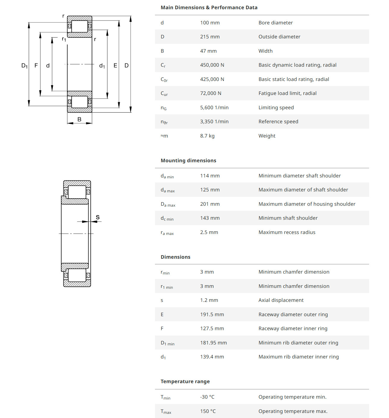FAG NJ320-E-XL-M1-C3 มีขนาดวงใน 100 มิล วงนอก 215 มิล หนา 47 มิล เป็นตลับลูกปืนเม็ดทรงกระบอกแถวเดียว NJ Design แกนในสามารถถอดหลุดออกได้หนึ่งด้าน ทำให้สะดวกต่อการติดตั้ง รองรับแรงโหลดได้สูงมาก