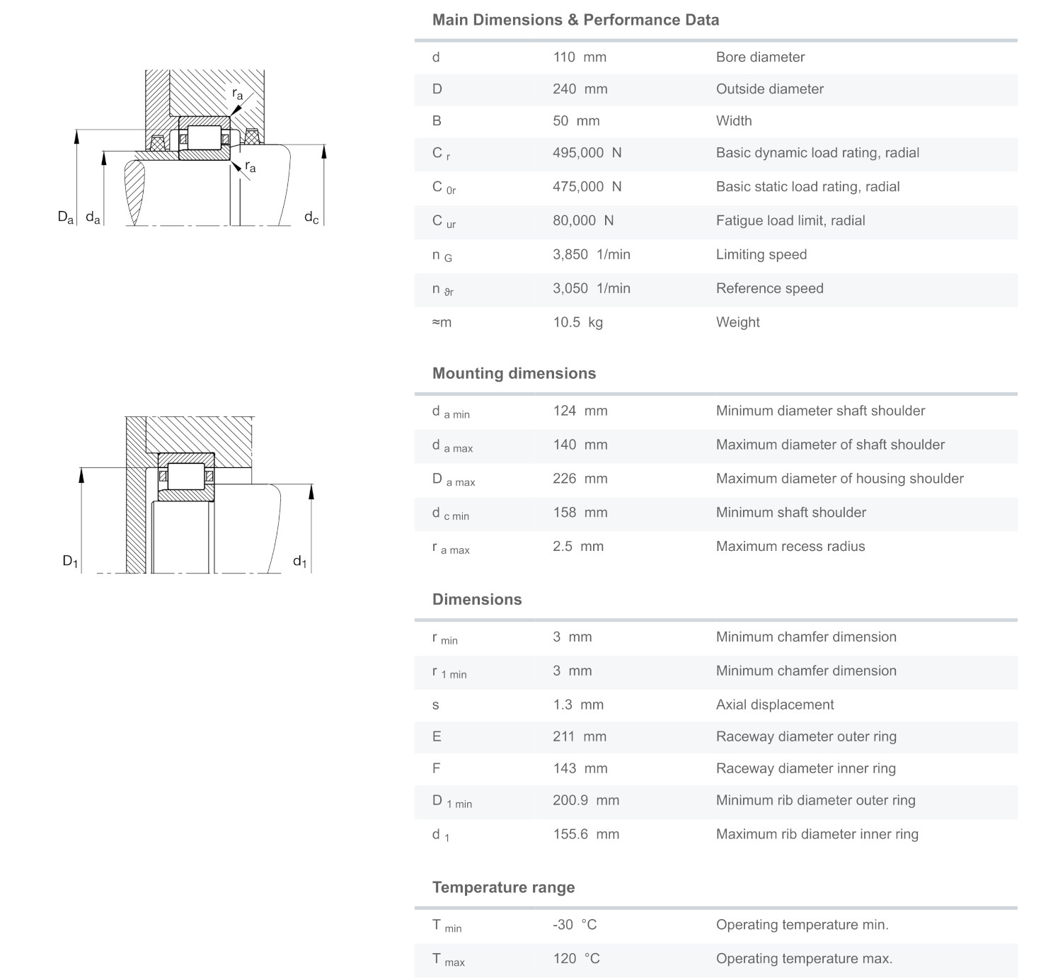 FAG NJ322-E-TVP2 มีขนาดวงใน 110 มิล วงนอก 240 มิล หนา 50 มิล เป็นตลับลูกปืนเม็ดทรงกระบอกแถวเดียว NJ Design แกนในสามารถถอดหลุดออกได้หนึ่งด้าน ทำให้สะดวกต่อการติดตั้ง รองรับแรงโหลดได้สูงมาก