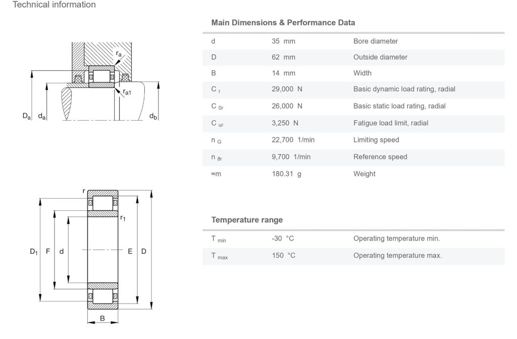 FAG NU1007-XL-M1 มีขนาดวงใน 35 มิล วงนอก 62 มิล หนา 14 มิล เป็นตลับลูกปืนเม็ดทรงกระบอกแถวเดียว มีลักษณะแกนในที่สามารถถอดหลุดออกได้ทั้ง 2 ด้าน ทำให้สะดวกต่อการติดตั้ง รองรับแรงโหลดได้สูงมาก มักพบได้ใน เกียร์, ปั๊ม, คอมเพรสเซอร์, มอเตอร์ไฟฟ้า เป็นต้น
