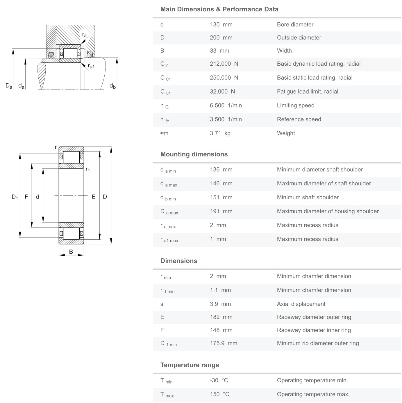 FAG NU1026-XL-M1-C3 มีขนาดวงใน 130 มิล วงนอก 200 มิล หนา 33 มิล เป็นตลับลูกปืนเม็ดทรงกระบอกแถวเดียว มีลักษณะแกนในที่สามารถถอดหลุดออกได้ทั้ง 2 ด้าน ทำให้สะดวกต่อการติดตั้ง รองรับแรงโหลดได้สูงมาก